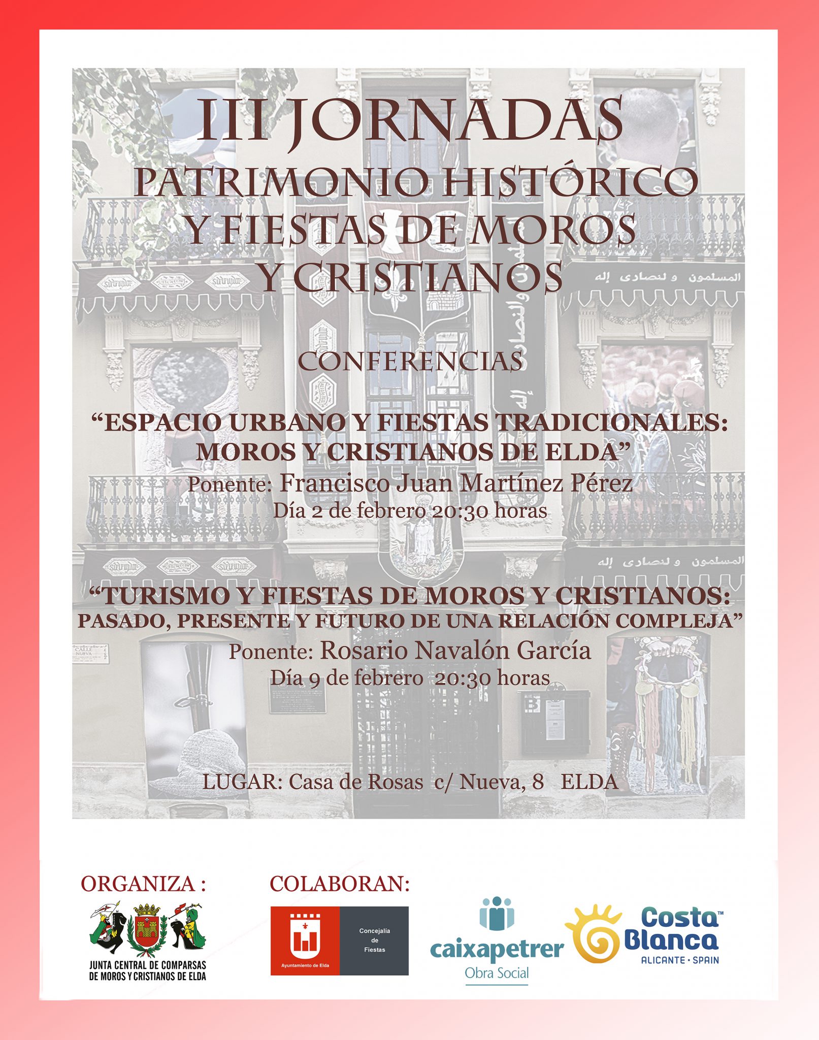 - «Espacio urbano y fiestas tradicionales: Moros y Cristianos de Elda». Ponente: Francisco Juan Martínez Pérez. Día 2 de febrero a las 20:30 horas.