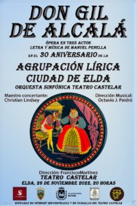 La Agrupación Lírica Ciudad de Elda celebra su 30 aniversario con la interpretación de ‘Don Gil de Alcalá’. Una ópera dividida en tres actos con letra y música de Manuel Penella bajo la dirección musical de Octavio J. Peidró y Christian Lindsey como maestro concertante.