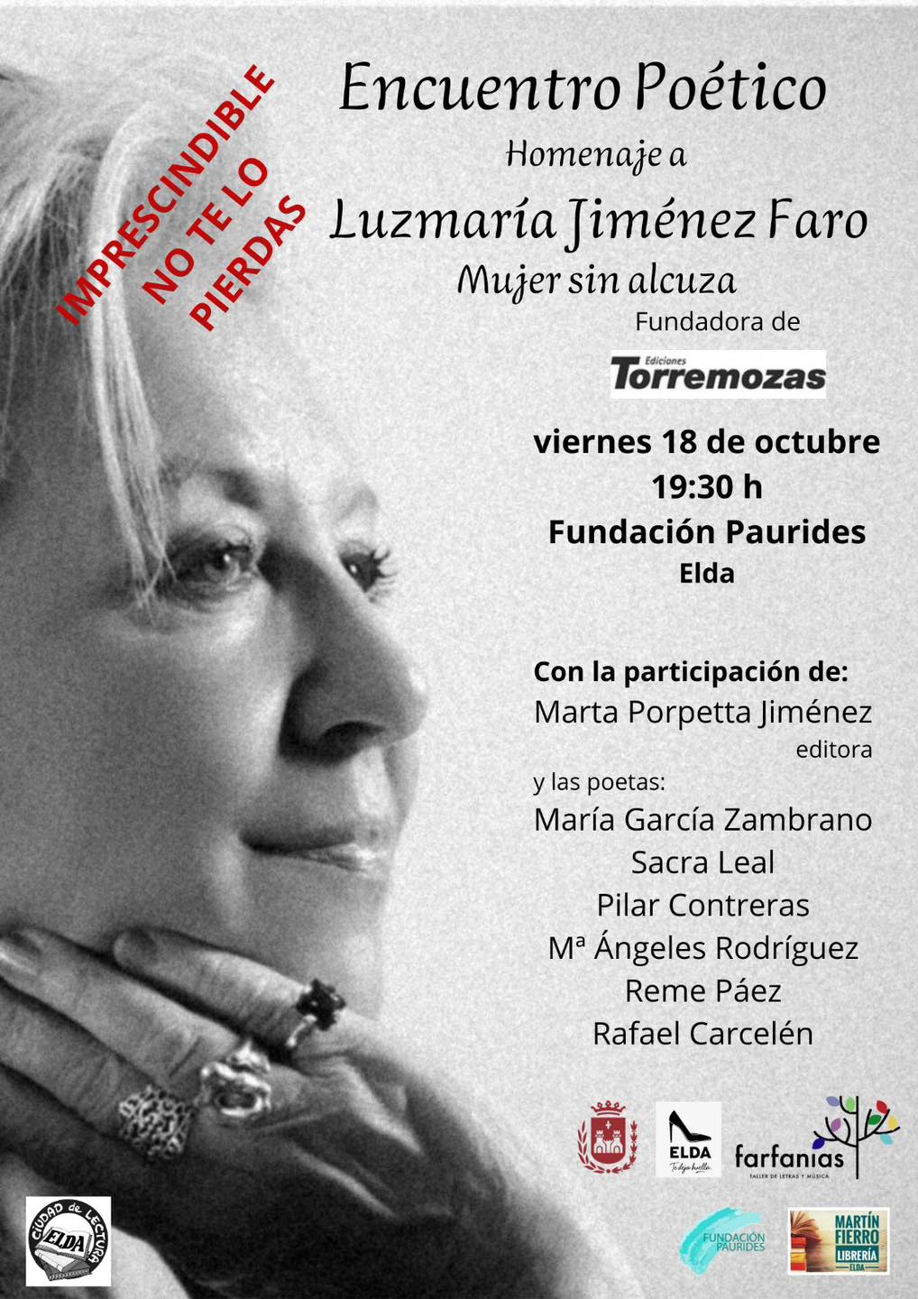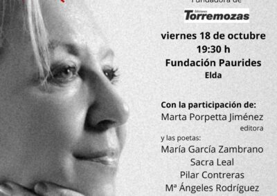 El encuentro tendrá lugar el próximo viernes 18 de octubre, a las 19:30 horas, en la Fundación Paurides. La velada, conducida por Rafael Carcelén y la bibliotecaria Reme Páez, contará con la presencia de Marta Porpetta, actual directora de la editorial e hija de la poeta y de su marido, el eldense Antonio Porpetta, ambos fundadores del sello Torremozas, especializado en la edición de la obra de mujeres poetas españolas e hispanoamericanas.