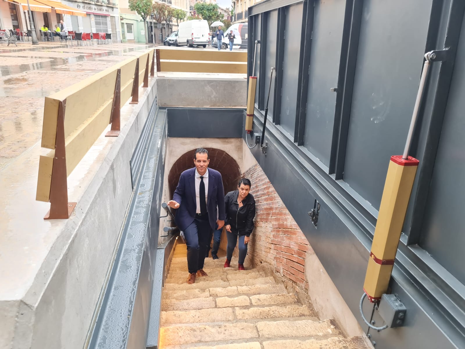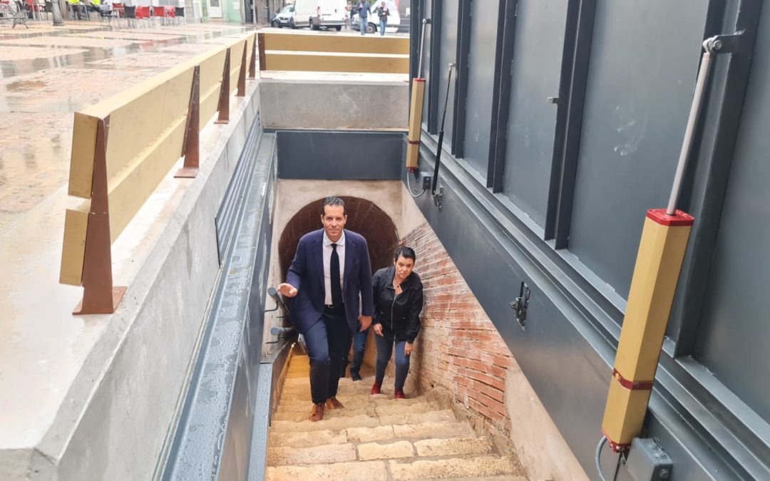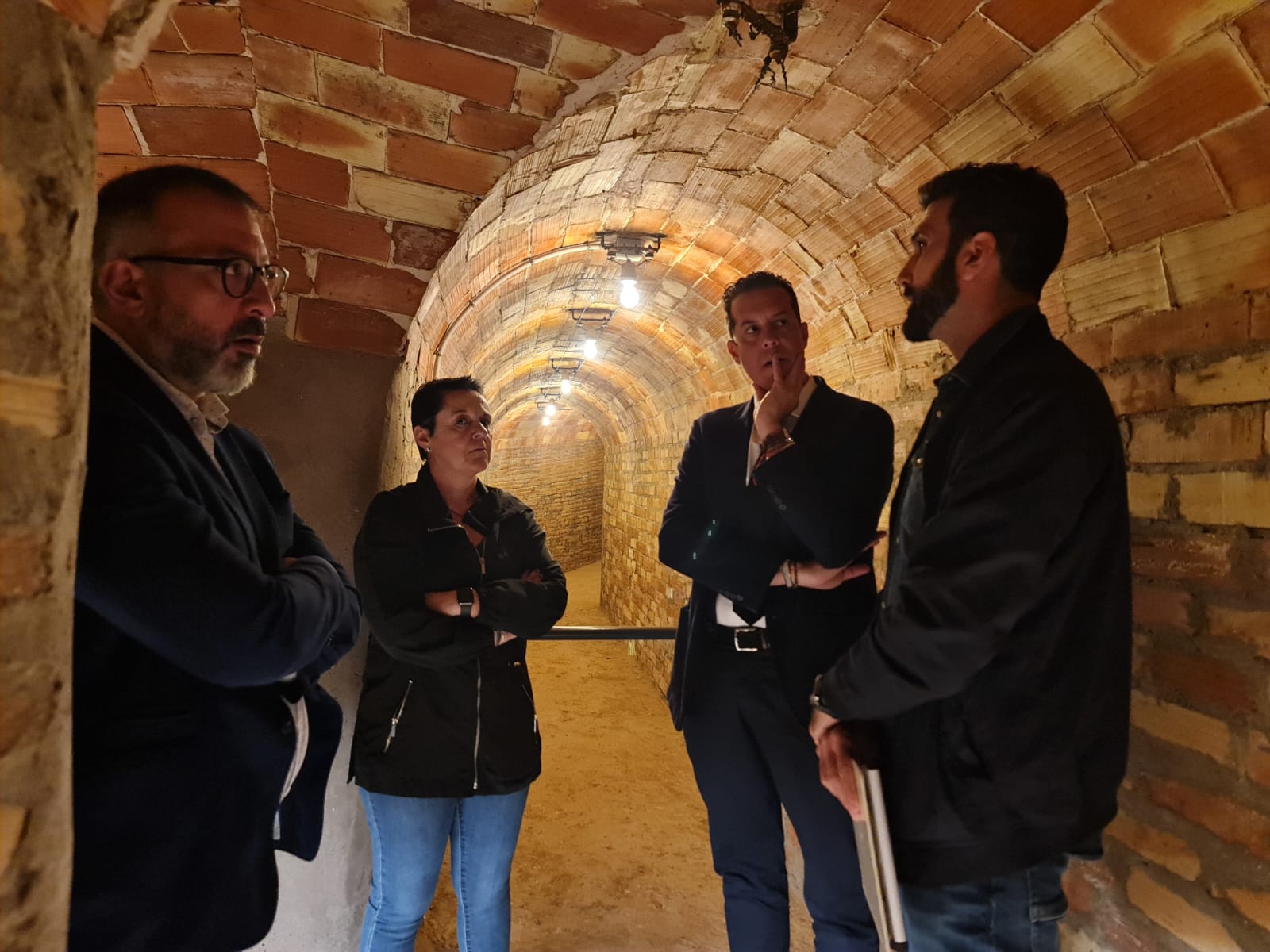 El alcalde de Elda, Rubén Alfaro, acompañado de la secretaria autonómica de Cooperación y Calidad Democrática, Toñi Serna, y del concejal de Inversiones y Servicios Públicos Sostenibles, José Antonio Amat, han realizado una visita técnica al refugio antiaéreo de la Guerra Civil ubicado bajo las plazas de Arriba y de la Constitución, y cuyos trabajos de rehabilitación y puesta en valor ya han finalizado.