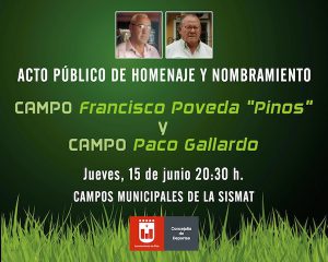 Este jueves día 15 tendrá lugar el acto público de homenaje y nombramiento de los campos municipales en honor de Francisco Poveda “Pinos” y Paco Gallardo, dos figuras históricas del arbitraje del fútbol base de nuestra ciudad.