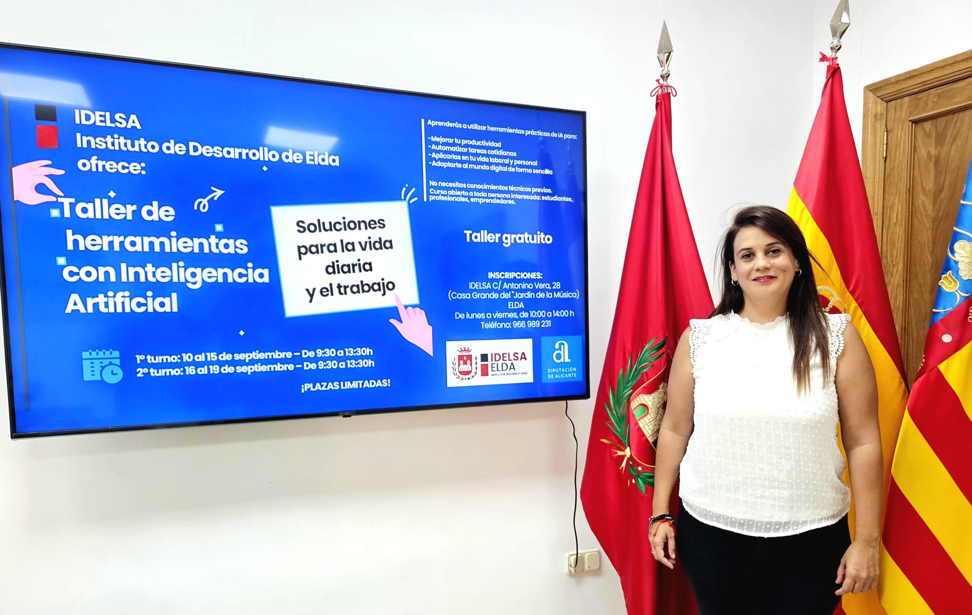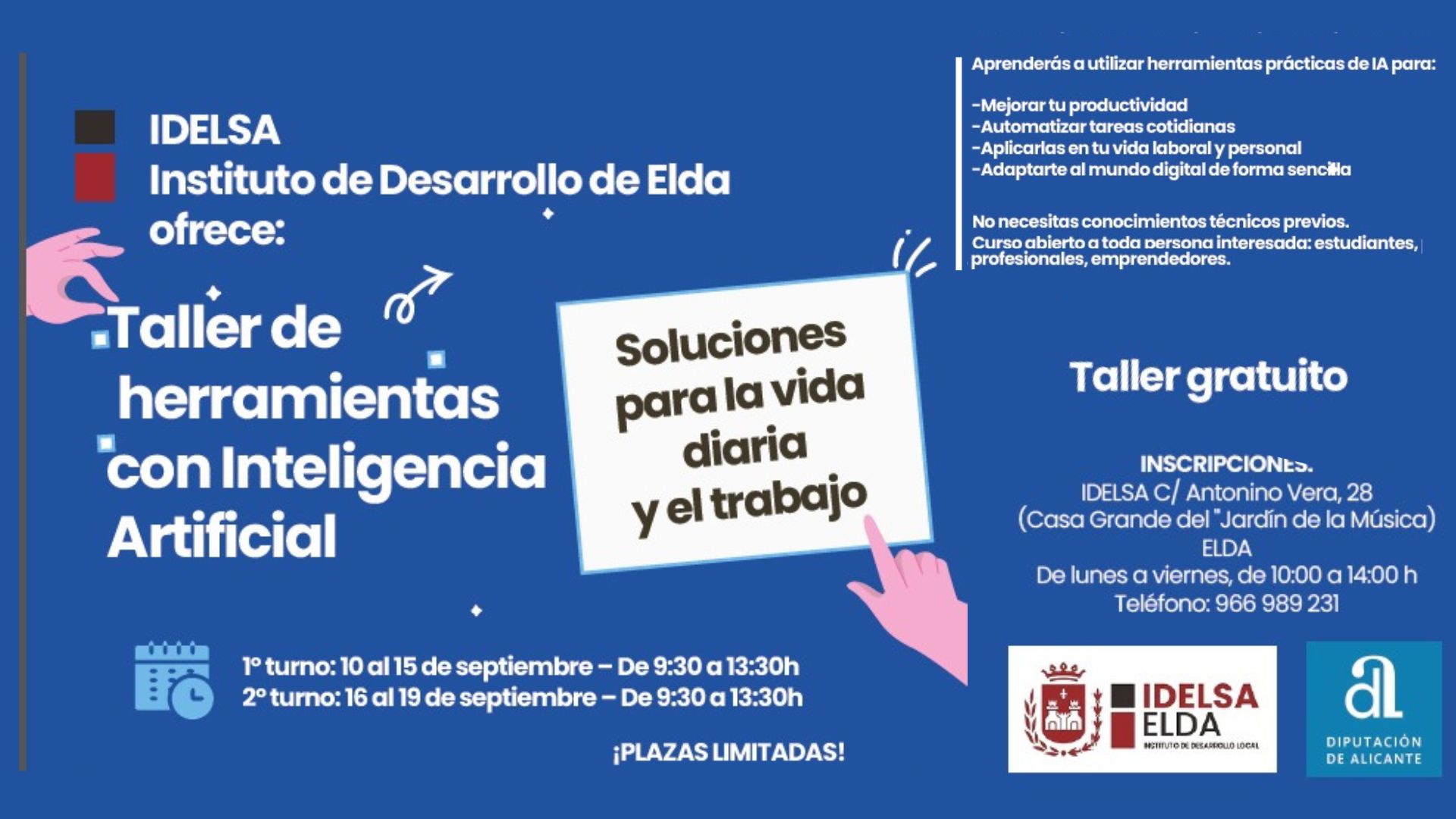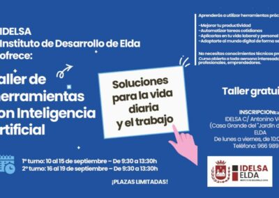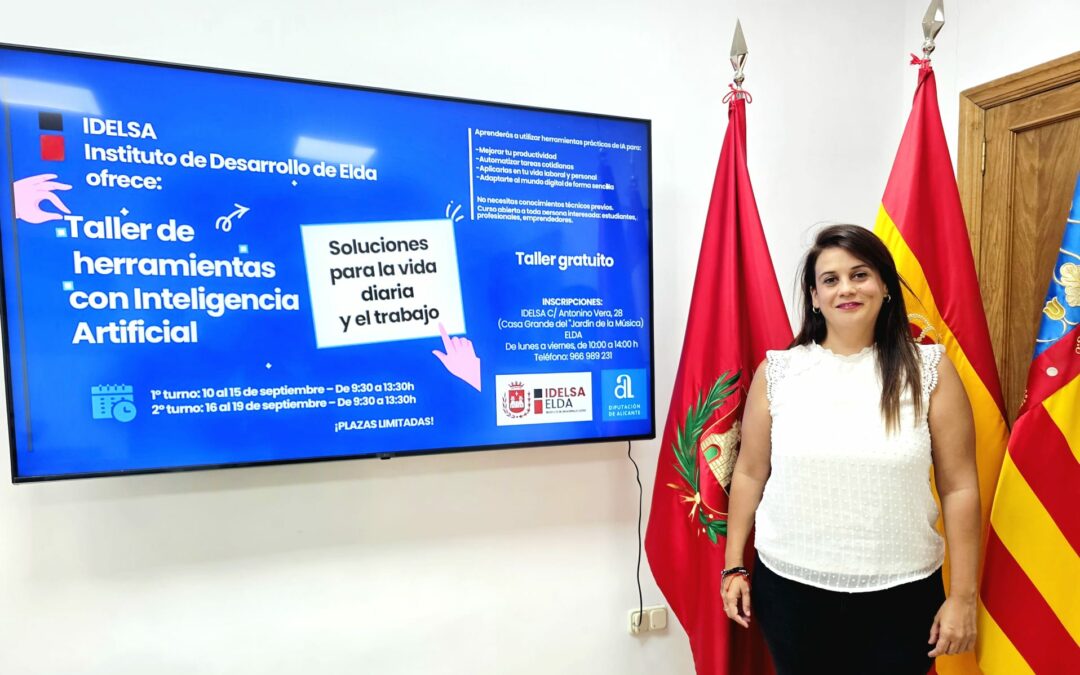 El Ayuntamiento de Elda, a través del Instituto de Desarrollo Local (Idelsa), ofrecerá un taller gratuito sobre herramientas de Inteligencia Artificial, que tendrá lugar en las instalaciones de la EURLE en dos turnos: del 10 al 15 de septiembre y del 16 al 19 de septiembre, ambos en horario de 9.30 a 13.30 horas.