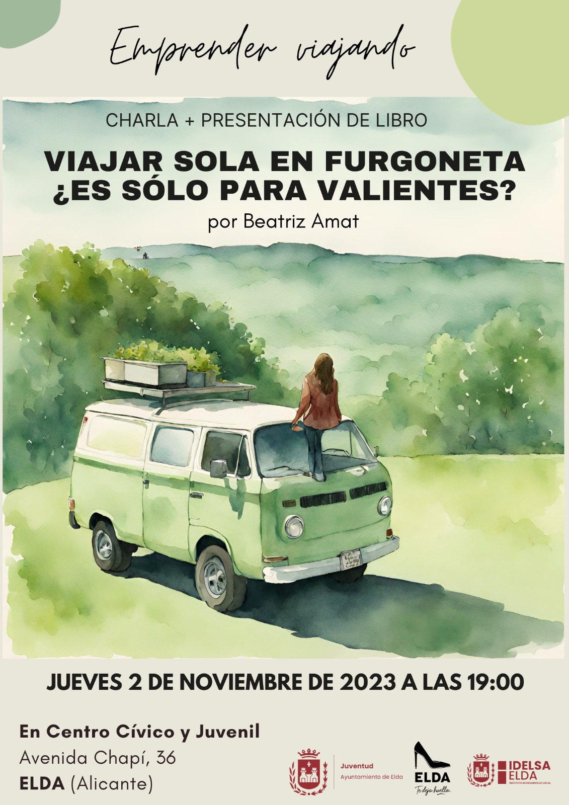 El Ayuntamiento de Elda, a través del Instituto de Desarrollo Local (IDELSA), organiza una charla de Beatriz Amat con el objetivo de impulsar el emprendimiento, especialmente el femenino, en la ciudad. Bajo el título ‘Viajar sola en furgoneta ¿es sólo para valientes?’, la conferencia tendrá lugar el próximo jueves, 2 de noviembre, a las 19.00 horas en el Centro Cívico y Juvenil y servirá también para presentar el libro del mismo título.