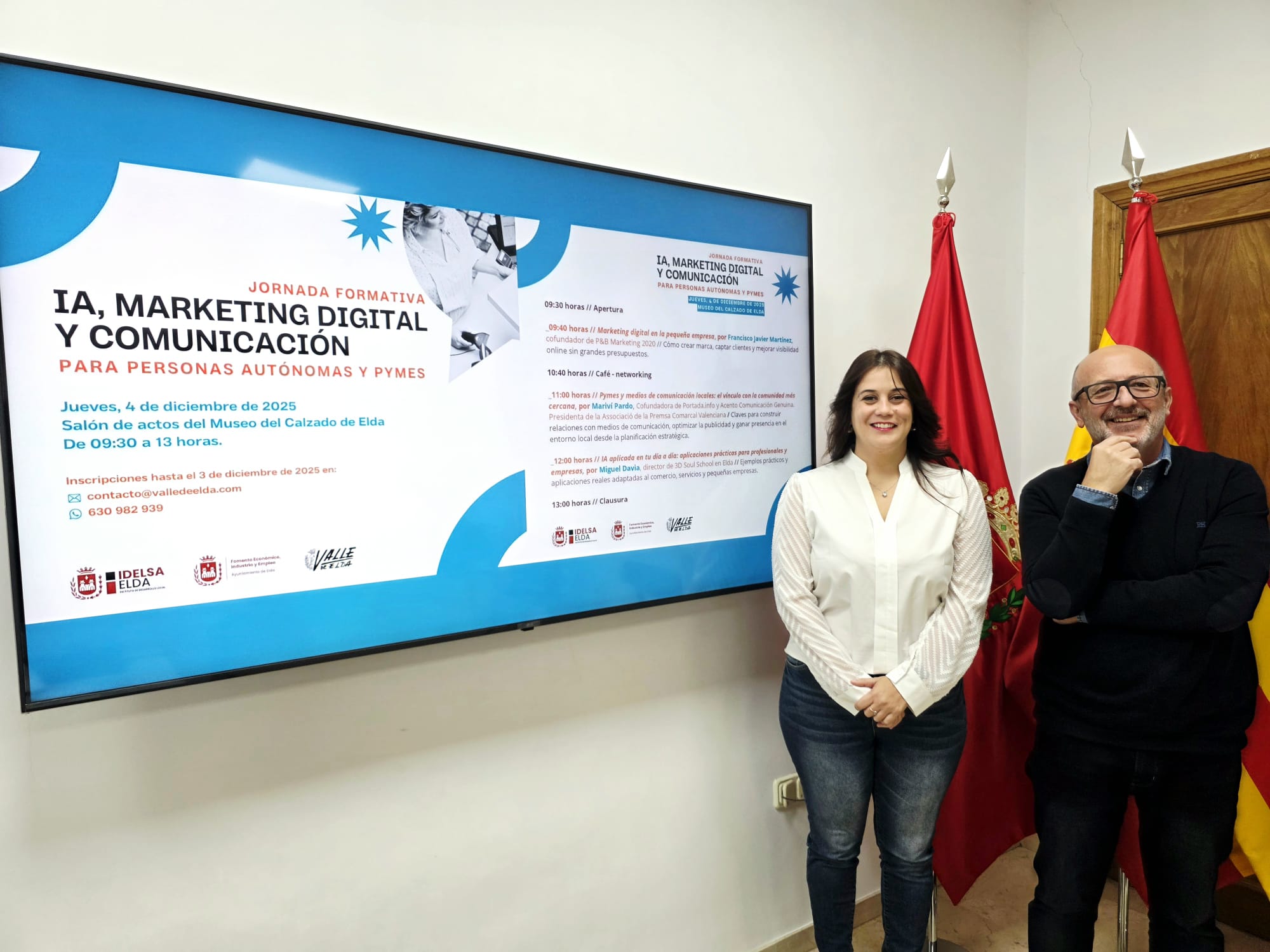 La concejala de Fomento Económico, Industria y Empleo, Lorena Pedrero, junto al director del semanaria Valle de Elda, Carlos Ortuño, ha presentado esta mañana una actividad que tiene como objetivo «fortalecer el tejido empresarial de la ciudad. Sabemos que los negocios locales se enfrentan a nuevos retos ligados a las nuevas tecnologías y, por ese motivo, hemos organizado esta jornada que tiene objetivos muy concretos: ofrecer una formación accesible, fomentar herramientas innovadoras y adaptadas a pymes y autonómos».