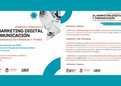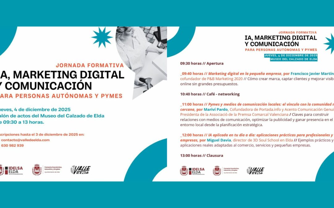 El Ayuntamiento de Elda, a través de Idelsa, organiza junto a Valle de Elda una jornada formativa sobre Inteligencia Artificial (IA), marketing digital y comunicación dirigido a pymes y autónomos. La formación tendrá lugar el jueves 4 de diciembre, de 9.30 a 13.00 horas en el salón de actos del Museo del Calzado.