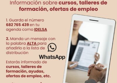 Para registrarse en esta lista de distribución hay que guardar en la agenda del teléfono móvil el número 682 765 439 como IDELSA. A continuación hay que mandar un mensaje con la palabra ALTA para añadirlo en la lista de distribución. A partir de ese momento el usuario o usuaria registrados comenzará a recibir información sobre cursos, talleres de formación, ayudas, ofertas de empleo, etc.