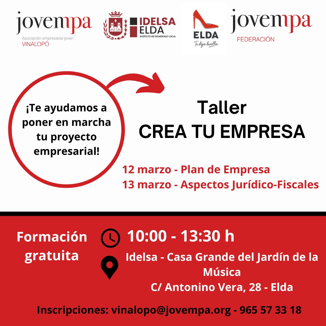 El próximo martes, 12 de marzo, dará comienzo una nueva edición del ciclo de talleres de formación ‘Crea tu empresa’, fruto del convenio entre el Instituto de Desarrollo de Elda (IDELSA), la Asociación de Jóvenes Empresarios de la Comarca del Medio Vinalopó y la Federación de Asociaciones de Jóvenes Empresarios de la Provincia de Alicante.