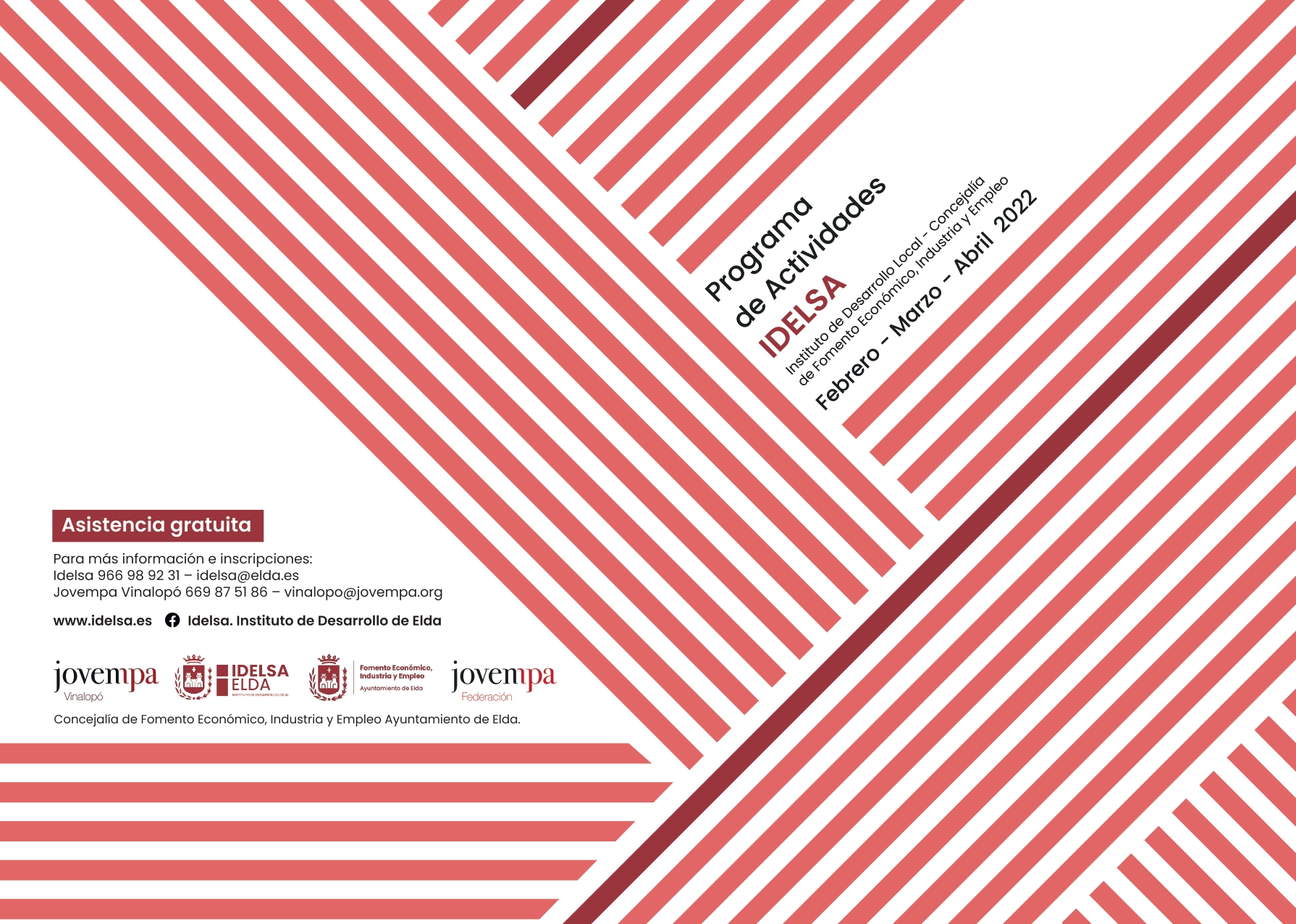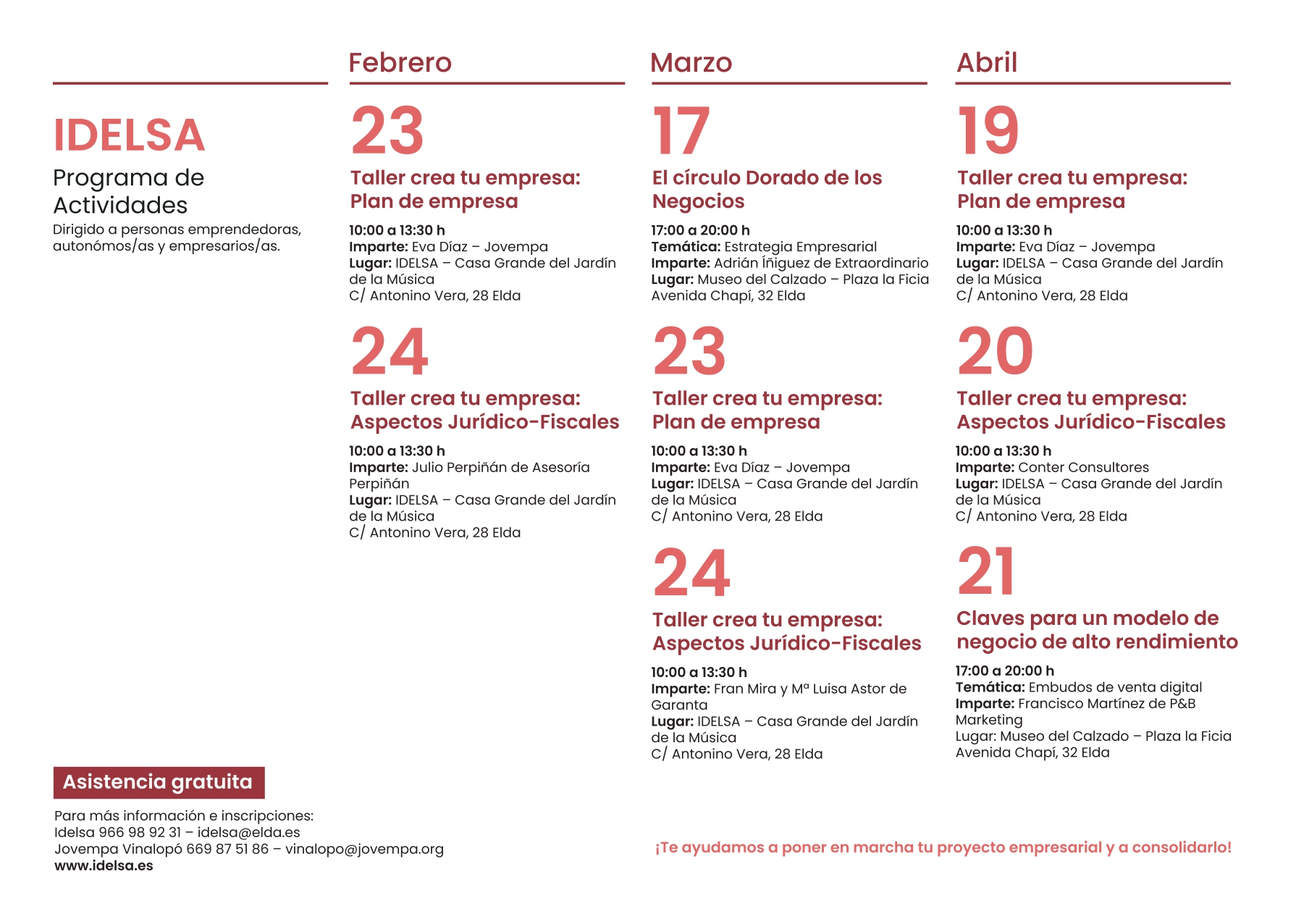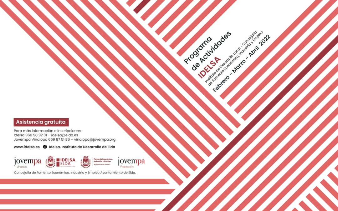 El Ayuntamiento de Elda, a través del Instituto de Desarrollo Local (IDELSA), ha organizado un programa de actividades para los meses de febrero, marzo y abril dirigido a personas emprendedoras, autónomos y empresas de Elda. Los talleres organizados son de carácter gratuito y su organización se enmarca en el convenio suscrito con Jovempa Vinalopó.