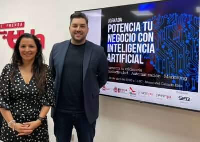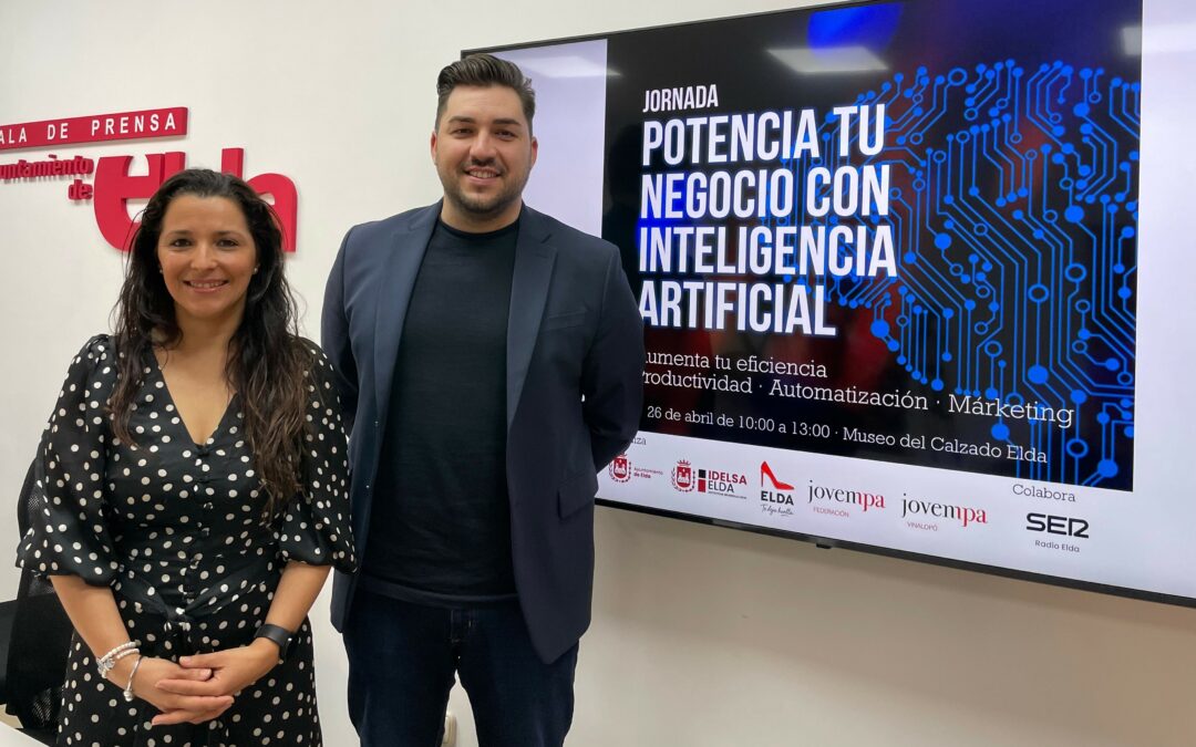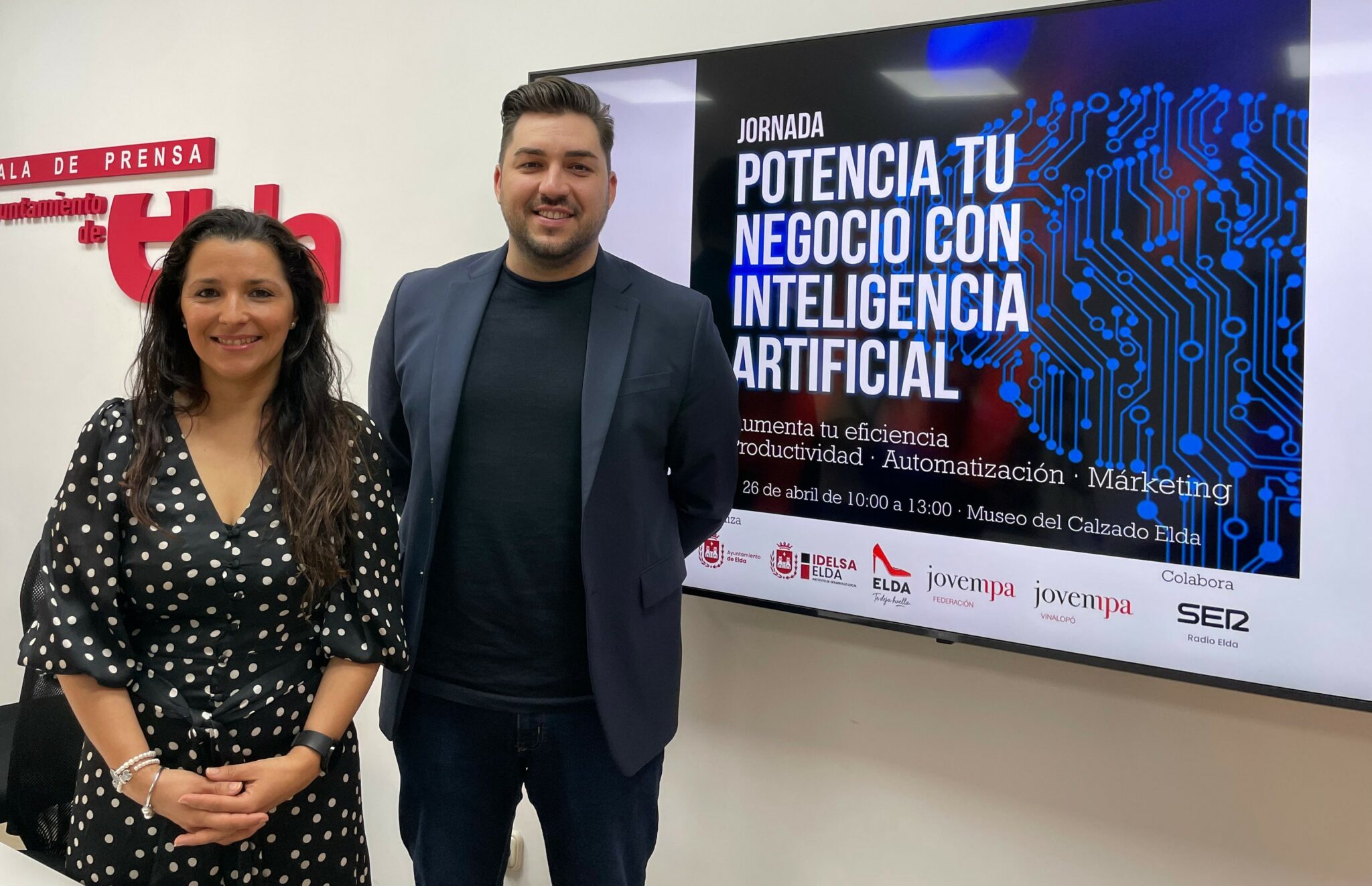 La concejala de Fomento Económico, Industria y Empleo, Elizabeth Belda, acompañada por el presidente de Jovempa Vinalopó, Víctor Íñiguez, han presentado una jornada dirigida a emprendedores y autónomos en la que se abordará la aplicación de la inteligencia artificial (IA) en los negocios.