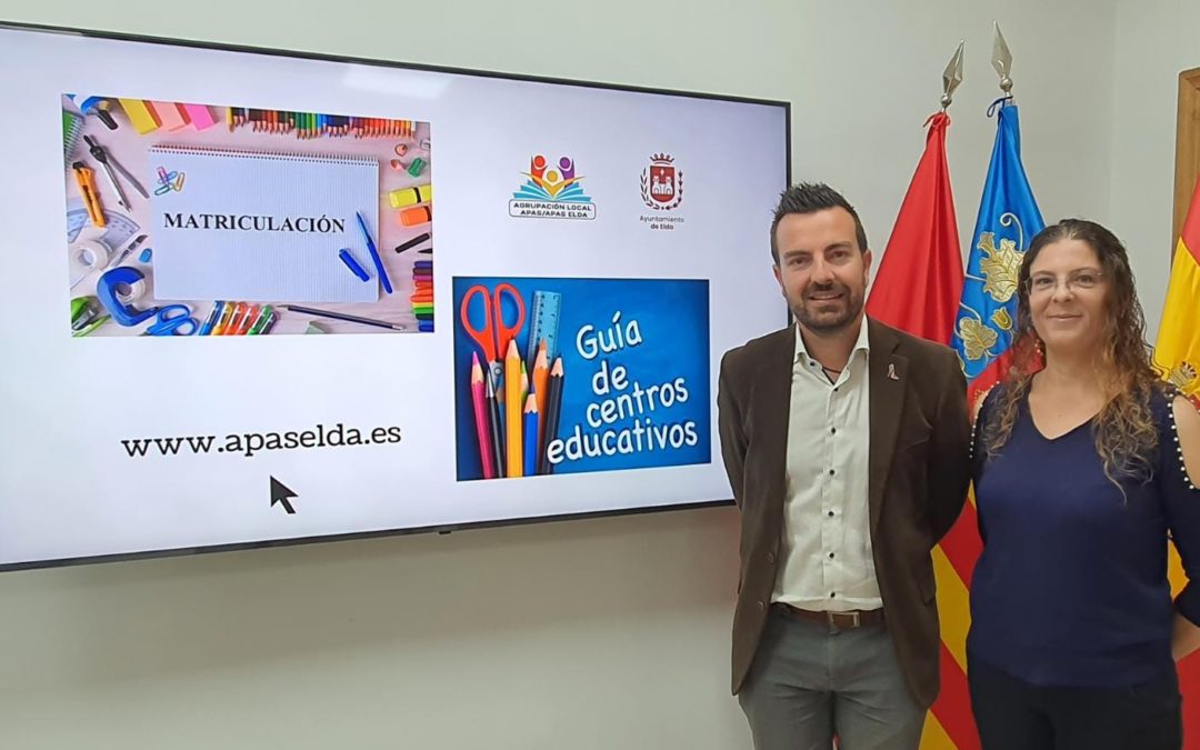 El concejal de Educación, Fernando Gómez, y la vicepresidenta de la Agrupación Local de Ampas de Elda, Raquel Cerdán, han presentado esta mañana la guía de centros educativos de la ciudad que está disponible en la web de la agrupación (www.apaselda.es). El edil ha explicado que “es una herramienta muy útil para que las familias de los niños y niñas conozcan todos los centros educativos que hay en nuestra ciudad y puedan conocer durante el periodo de matriculación a qué centro pueden acudir sus hijos”.