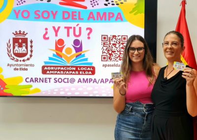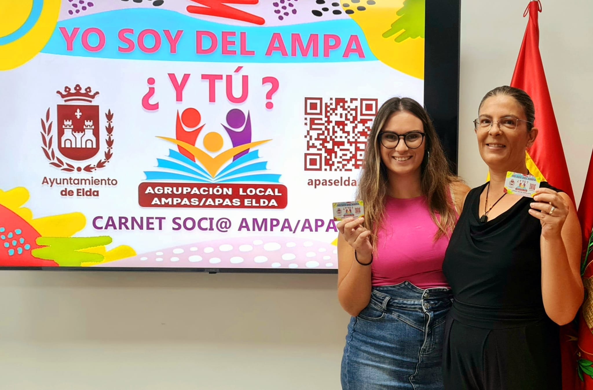 La concejala de Educación, María Gisbert, y la vicepresidenta de la Agrupación Local de Ampas de Elda, Raquel Cerdá, han presentado el carné de socio que por tercer curso consecutivo pone en marcha la Agrupación. «Se trata de una iniciativa que, en palabras de la edil del área, permite dotar de un símbolo de identidad a todos los padres y madres que componen el colectivo de Ampas de nuestra ciudad».