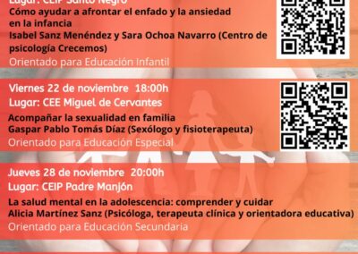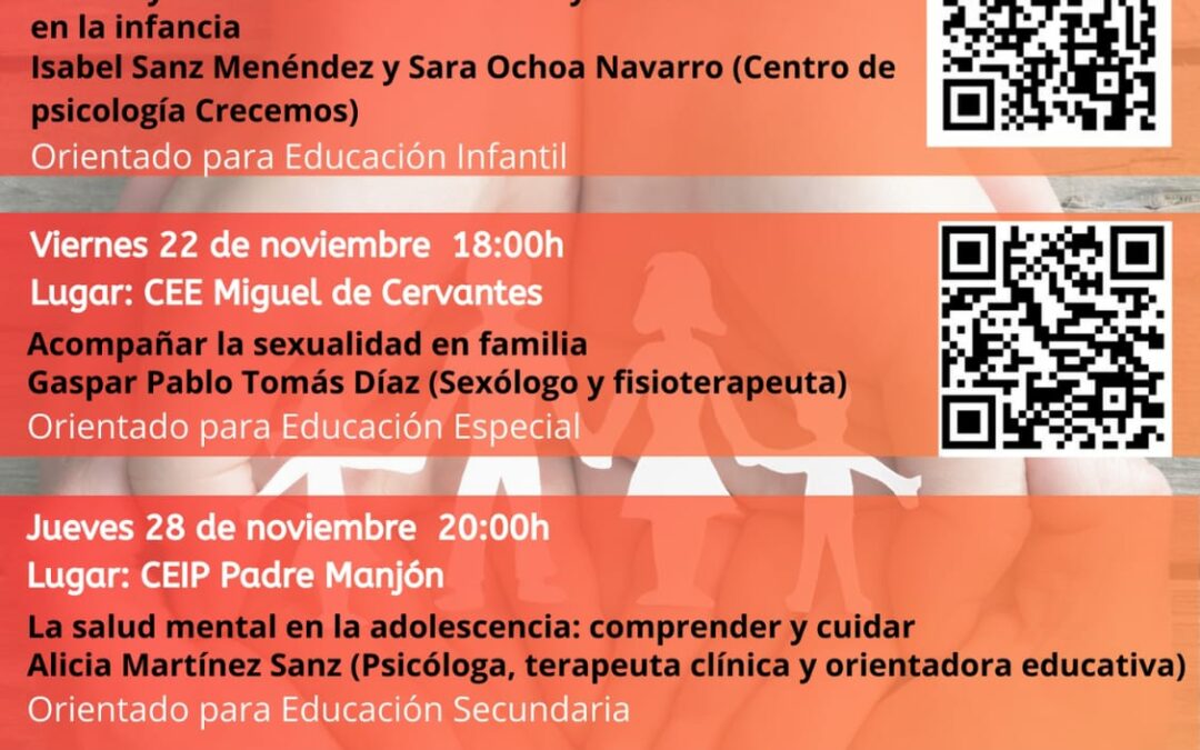 «Acompañar las sexualidades en familia». Ponente: Gaspar Pablo Tomás Díaz. Lugar de realización: CEE Miguel de Cervantes, 22 noviembre a las 18.00 horas.