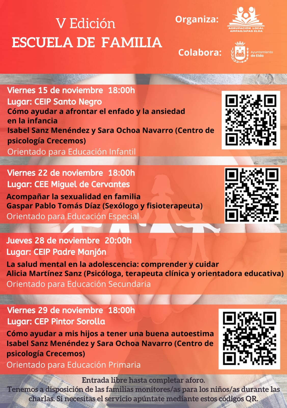 El Agrupación Local de AMPAS de Elda ha anunciado hoy la celebración de la quinta edición de la Escuela de Familias, un proyecto educativo que tiene como objetivo convertirse en foro formativo para las familias del alumnado eldense. En esta ocasión se realizarán cuatro interesantes conferencias que darán pautas a cuatro principales niveles educativos: Infantil, Primaria, Secundaria y Educación Especial.