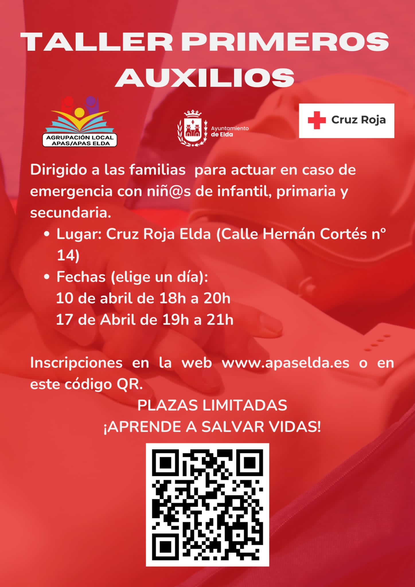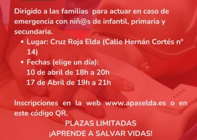 El curso se realizará en la sede de Cruz Roja el 10 de abril, de 18.00 a 20.00 horas, y el 17 de abril, de 19.00 a 21.00 horas Esta actividad es de carácter gratuito y con plazas limitadas a un máximo de 30 participantes en cada sesión. Para poder inscribirse hay que rellenar el formulario escaneando el código QR que acompaña la imagen promocional o entrando a la página web www apaselda.es