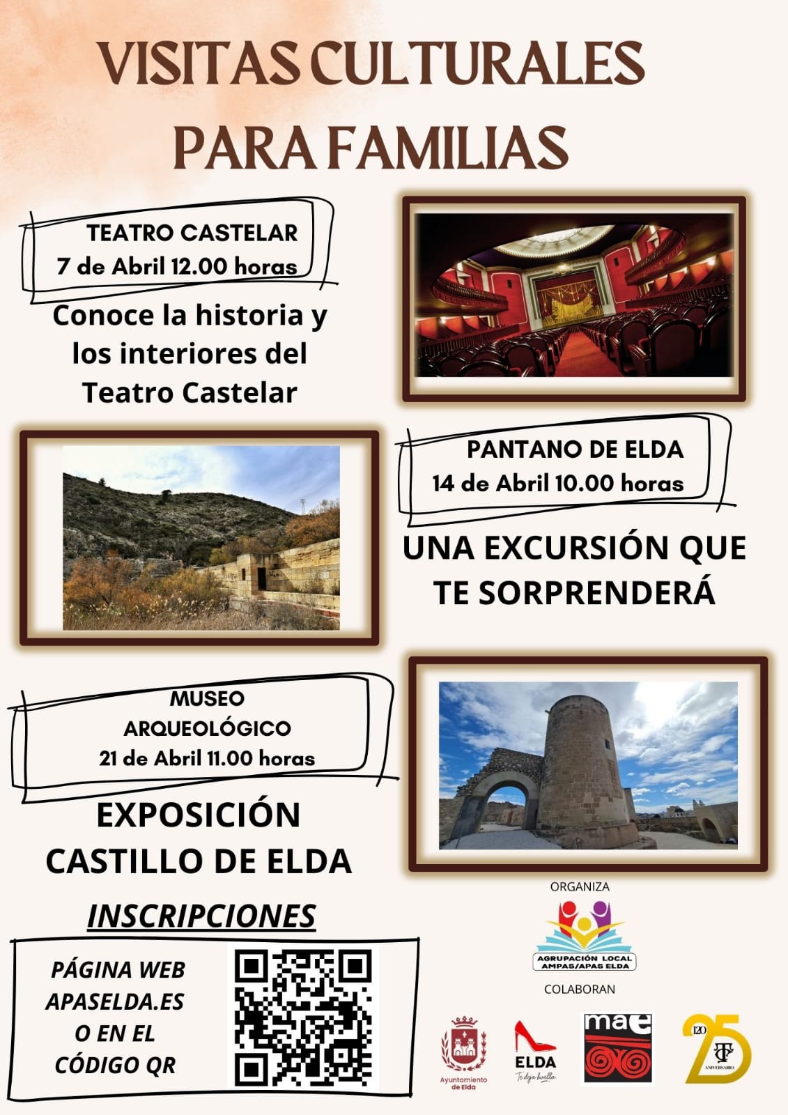 La Agrupación Local de Ampas de Elda, en colaboración con el Ayuntamiento de Elda, pone en marcha una nueva edición de Visitas Culturales para Familias con el fin de dar a conocer el patrimonio cultural de nuestra ciudad. La vicepresidenta de la Agrupación Local de Ampas, Raquel Cerdá, ha explicado que «este año vamos a conocer tres puntos de gran relevancia de nuestra ciudad como son el Teatro Castelar, el Pantano de Elda y el Castillo. Comenzaremos el 7 de abril a las 12.00 horas en el teatro Castelar, dónde conoceremos sus 120 años de historia, visitando todos los espacios interiores».