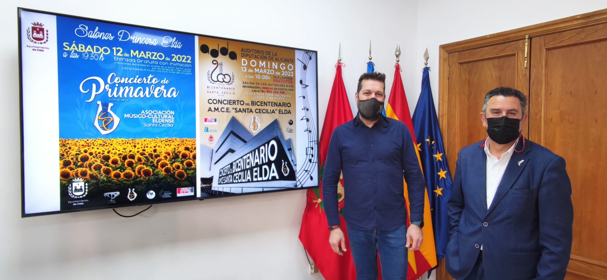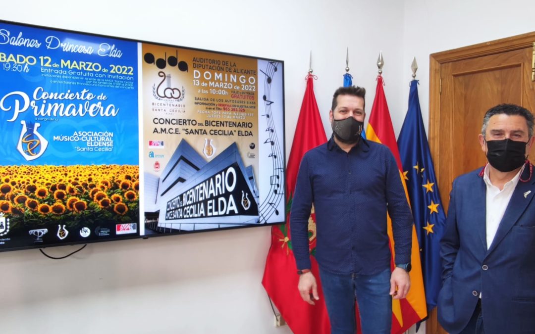 El concejal de Deportes, Amado Navalón, y el presidente de AMCE Santa Cecilia, David Mancera, han presentado hoy dos nuevos conciertos que este fin de semana ofrecerá la banda eldense dentro de las actividades de celebración de su 200 aniversario.
