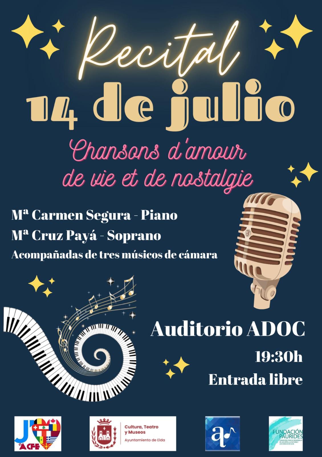 El recital tendrá lugar el viernes 14 de junio, a las 19.30 horas en el Auditorio ADOC. «Invitamos a toda la ciudadanía de Elda y a los amantes del arte y la música a unirse a nosotros en este recital único», ha concluido la presidenta de la Asociación Cultural Francófona de Elda.