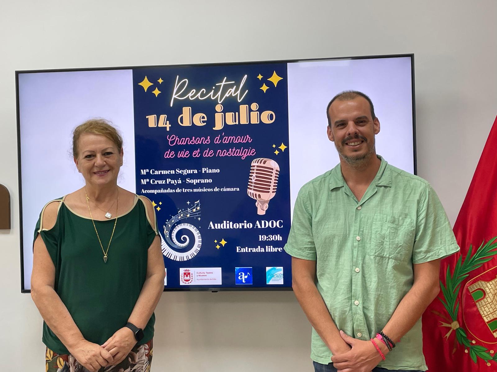 El concejal de Cultura, Iñaki Pérez, y la presidenta de la Asociación Cultural Francófona de Elda, Pepi Jover, han presentado esta mañana el recital ‘Chansons d’amour, de vie et de nostalgie’ que con motivo de la celebración del 14 de julio, Día Nacional de Francia, tendrá lugar en el Auditorio ADOC.