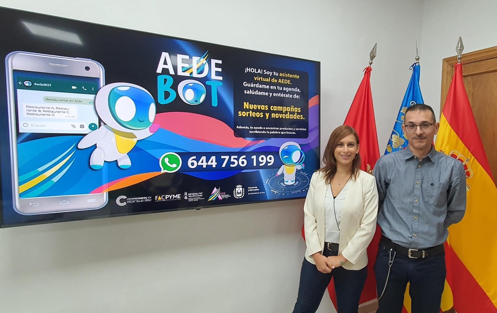 La concejala de Comercio y Mercados, Silvia Ibáñez, y el presidente de la Asociación de Empresarios de Elda (AEDE), Manuel Carpio, han presentado hoy un nuevo servicio de mensajería que, a través de WhatsApp, permitirá localizar comercios y conocer los servicios y promociones que ofrecen. La aplicación, denominada ‘AEDE Bot’, funciona a través del número 644 756 199.