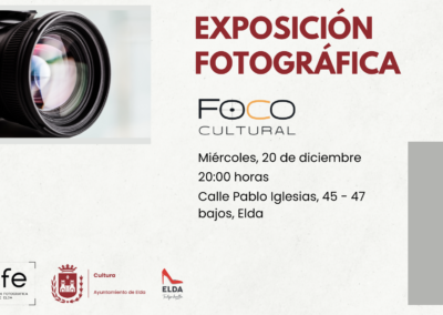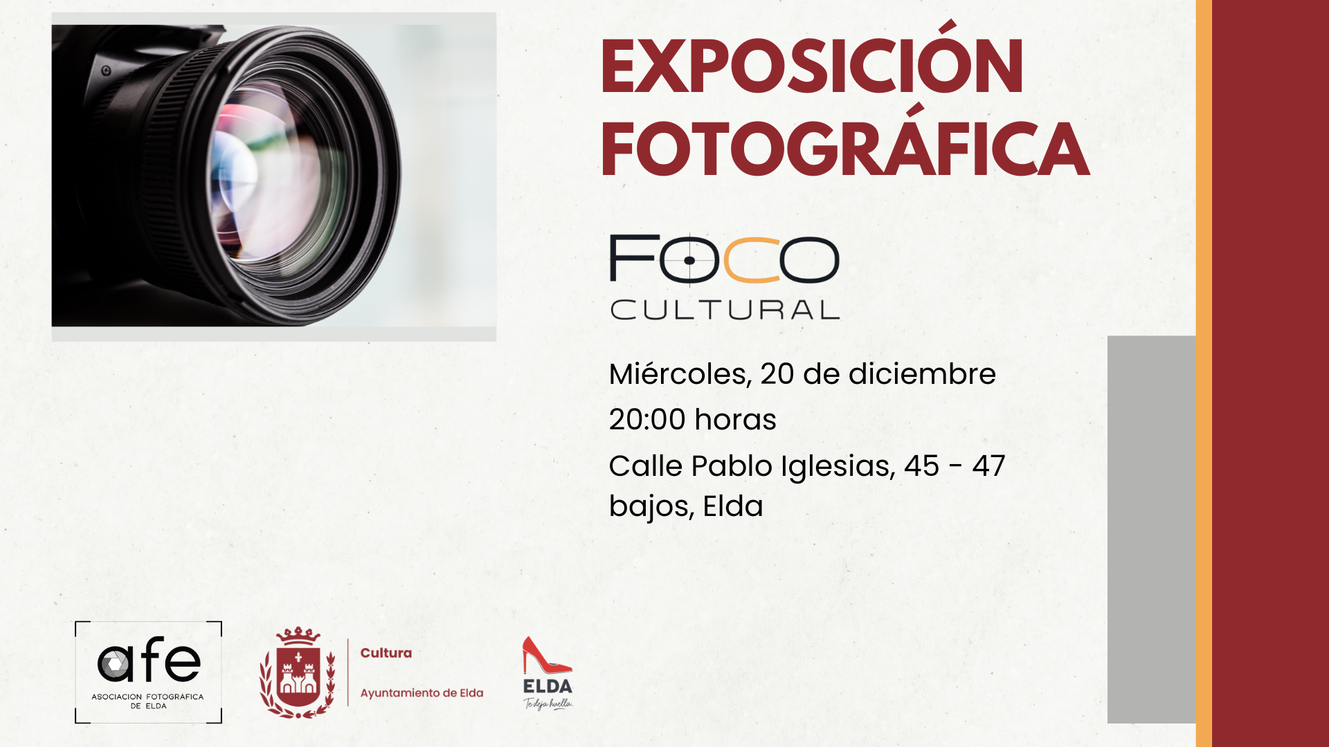 La Asociación Fotográfica de Elda ha anunciado hoy la inauguración de ‘Foco Cultural’, un espacio de exposiciones ubicado en la sede que comparte con la Casica del Artista y la coral Elda Canta, situada en la calle Pablo Iglesias, 45. La inauguración se llevará a cabo con la apertura de una muestra fotográfica, el próximo miércoles 20 de diciembre, a las 20.00 horas. La exposición permanecerá abierta durante todo el mes de enero.