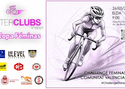 Elda acogerá el próximo domingo, 26 de mayo, a partir de las 9.00 horas la primera edición de la Copa Féminas de ciclismo femenino, prueba de carácter nacional incluida además en la Challenge de la Comunidad Valenciana. El Club Ciclista Inter Race Vinalopó de Elda, en colaboración con el Ayuntamiento de Elda, organiza esta prueba que es la octava de la competición y que se desarrollará en un circuito de 5 kilómetros en la Avenida de Ronda.