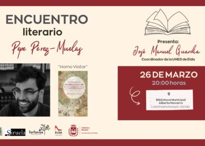 La Biblioteca Municipal Alberto Navarro acoge hoy un nuevo encuentro literario. El edil de Cultura, Iñaki Pérez, ha afirmado que «esta vez conoceremos a Pepe Pérez-Muelas, autor del ensayo ‘Homo Viator’, que como bien indica su nombre ‘hombre viajero’, narra la historia de la humanidad a través de sus viajes. Con su protagonista, Urbano Monti, geógrafo del siglo XVI visitaremos diferentes territorios, museos y bibliotecas. Además, conoceremos a exploradores como Marco Polo, Colón… y a través de esos viajes conoceremos qué somos ya que forman parte de nuestra historia como sociedad”.