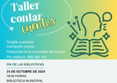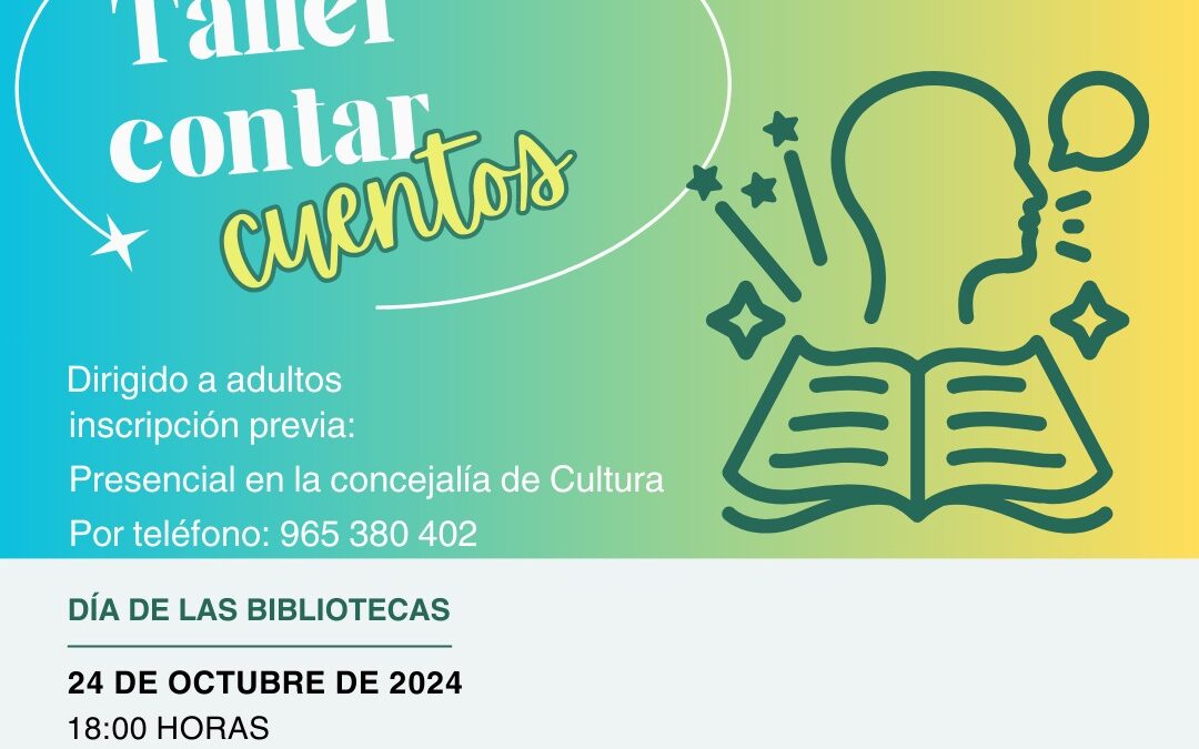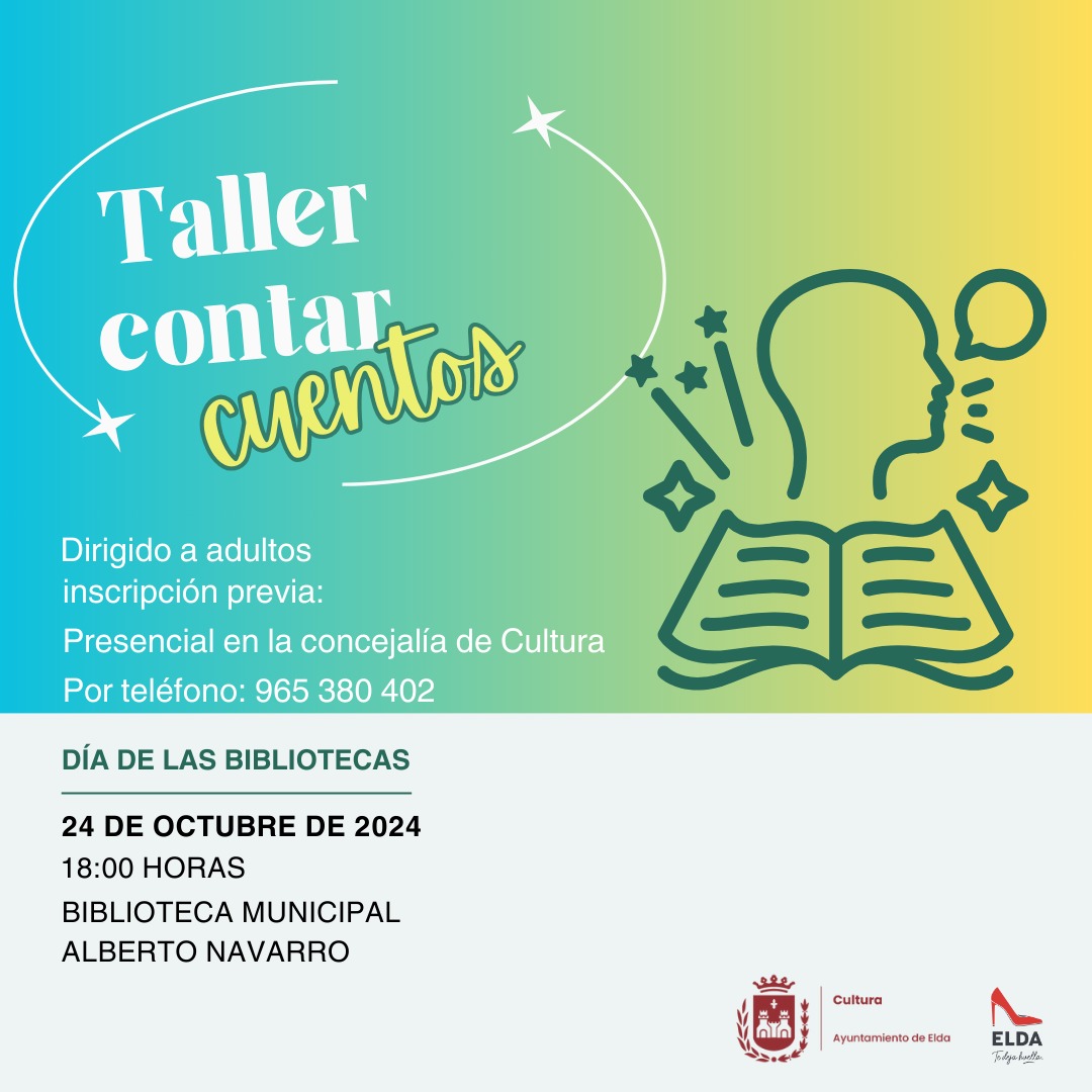 El próximo 24 de octubre se conmemora el Día de las Bibliotecas y, para celebrar este día, desde la Concejalía de Cultura del Ayuntamiento de Elda se ha organizado un taller práctico dirigido a adultos sobre el arte de contar cuentos, a las 18:00 horas en la Biblioteca Municipal Alberto Navarro.