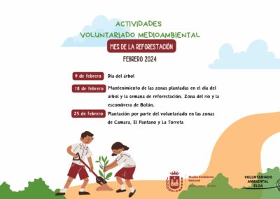 La edil del área ha afirmado que «continuando con las actividades, la siguiente será el 18 de febrero. Este día se realizarán labores de mantenimiento de las zonas plantadas en el Día del Árbol en el Río Vinalopó y en Bolón. Por último, el 25 de febrero se llevará a cabo una plantación en Camara, el Pantano y la Torreta. Todas las actividades comienzan a las 10.00 horas».
