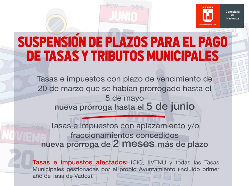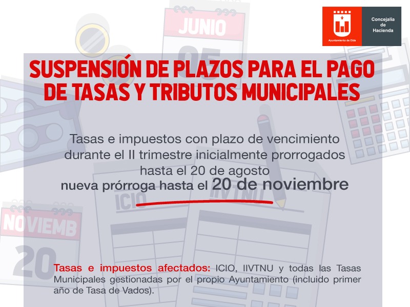 La Comisión, en la que están representados todos los grupos municipales del Ayuntamiento de Elda, ha sido informada del aplazamiento de la liquidación de tasas e impuestos con plazo de vencimiento de 20 de marzo hasta el 5 de junio, de la concesión de una nueva prórroga de dos meses para el pago de tasas e impuestos con aplazamientos y/o fraccionamientos concedidos y del aplazamiento hasta el 20 de noviembre de las tasas e impuestos inicialmente prorrogados hasta el 20 de agosto y con plazo de vencimiento durante el segundo trimestre.