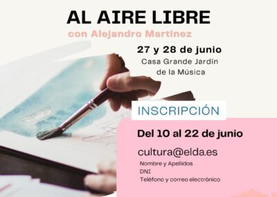 La Concejalía de Cultura del Ayuntamiento de Elda, en colaboración con el artista eldense Alejandro Martínez, organiza un curso de pintura al aire libre que se celebrará los próximos 27 y 28 de junio en el Jardín de la Música. Esta propuesta cultural busca acercar el arte a la ciudadanía y ofrecer un espacio formativo de calidad en un entorno natural.