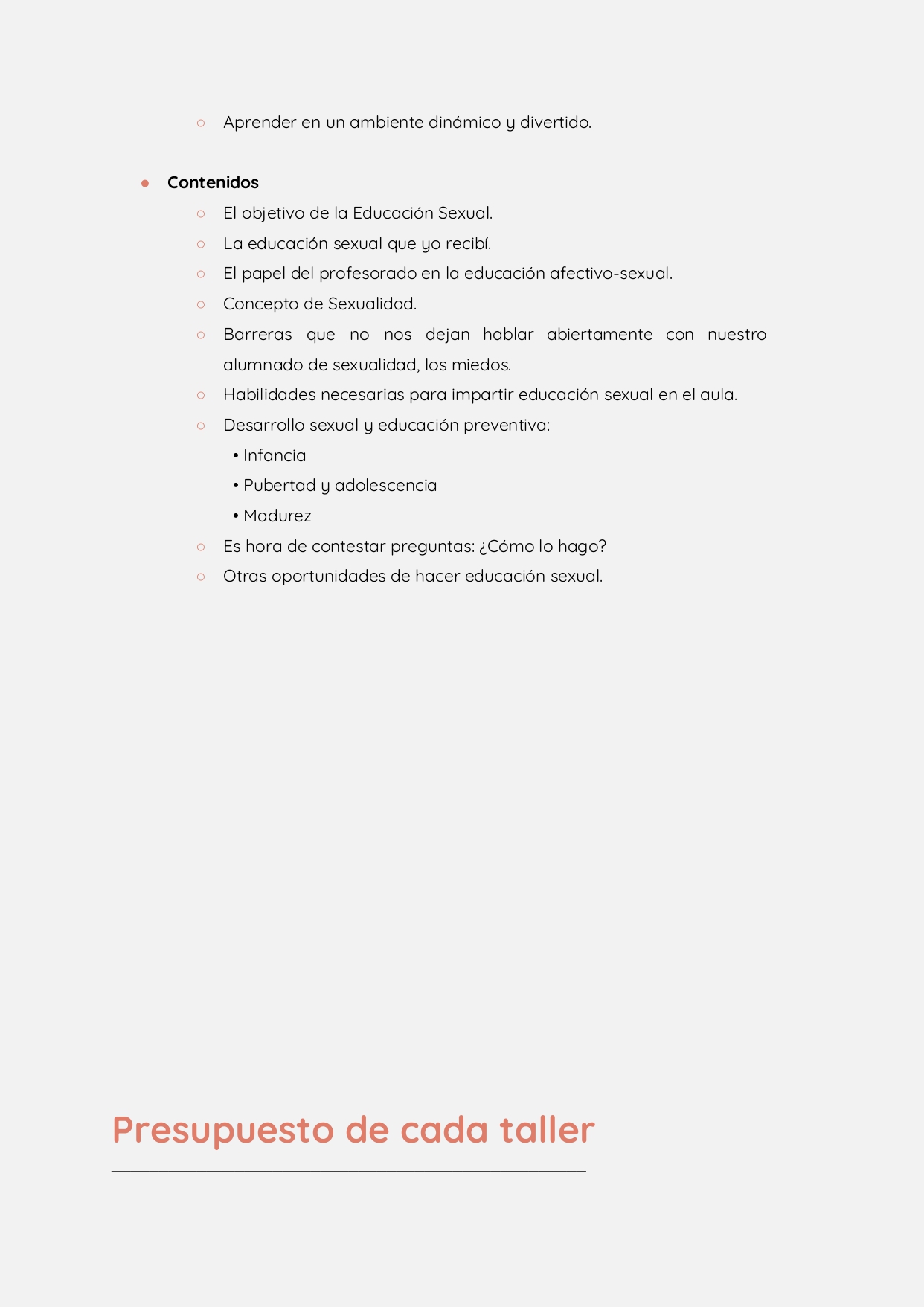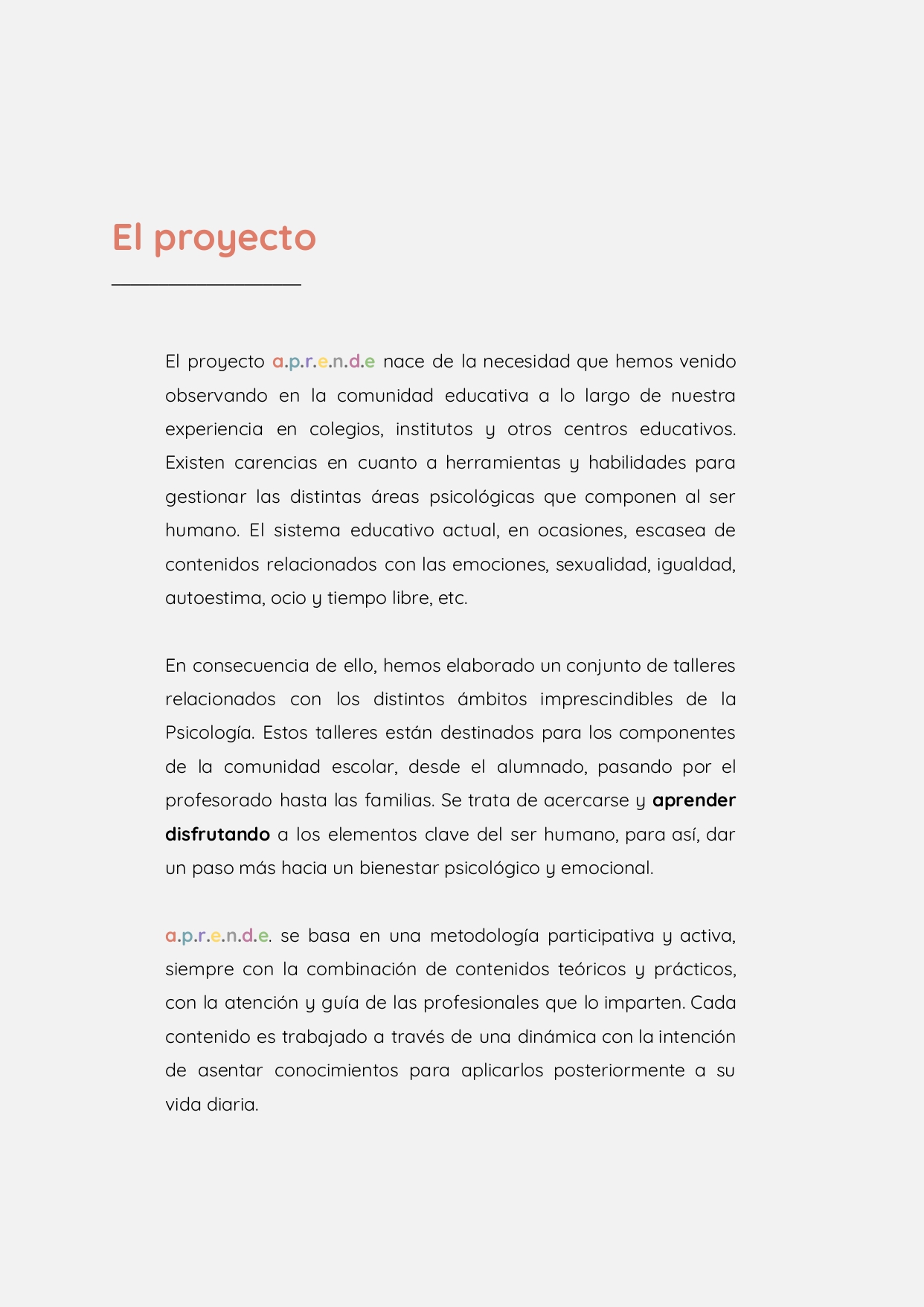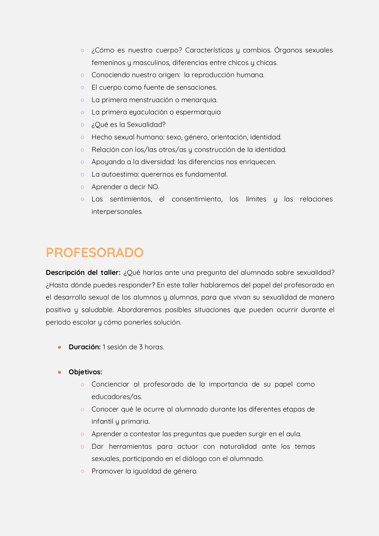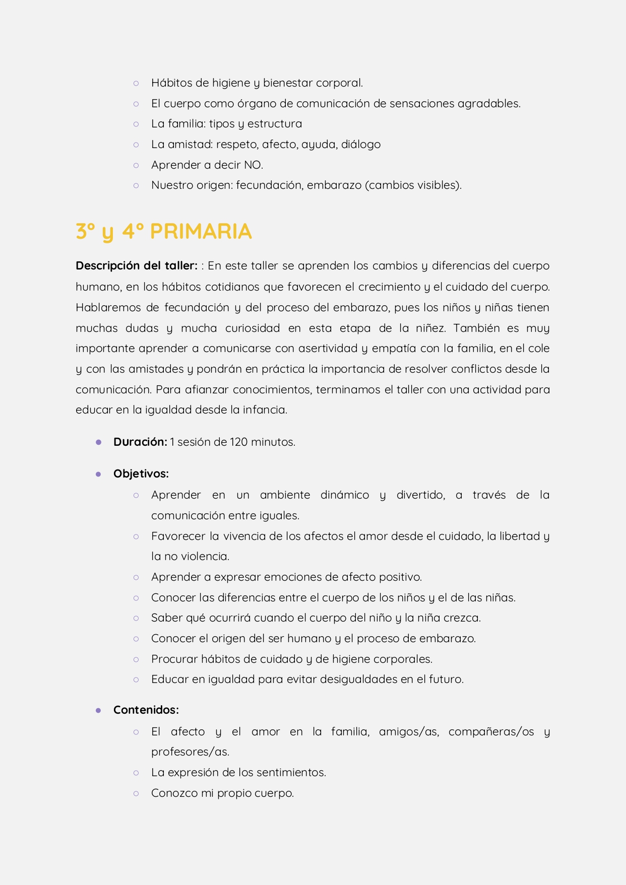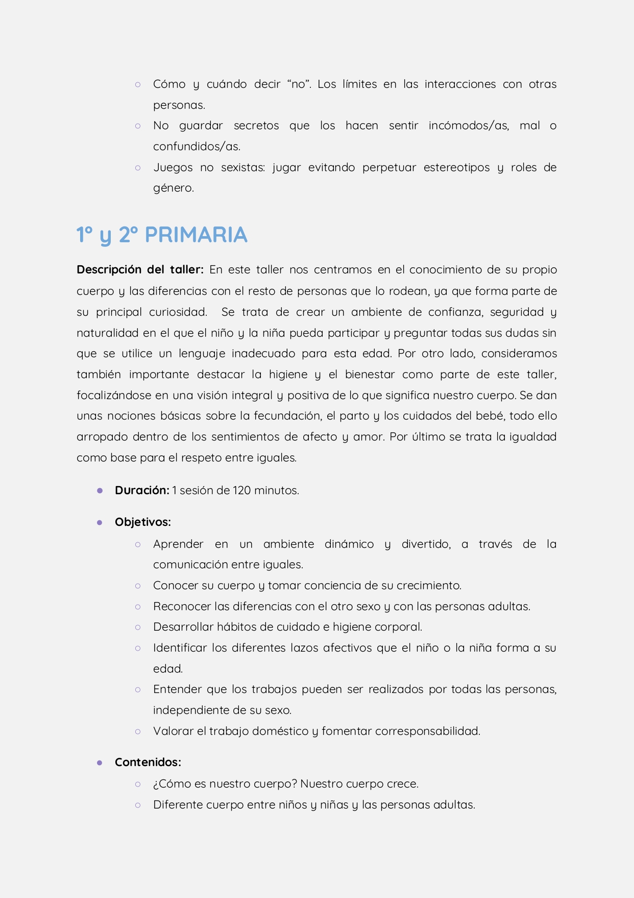 Estos talleres están destinados a todos los componentes de la comunidad escolar, desde el alumnado, pasando por el profesorado hasta las familias. La concejala ha afirmado que “se trata de acercarse y aprender disfrutando a los elementos clave del ser humano, para así, dar un paso más hacia un bienestar psicológico y emocional con una metodología participativa y activa, combinando contenidos teóricos y prácticos”.