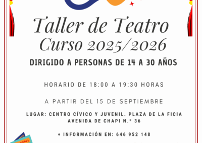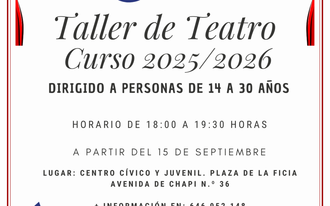 El Ayuntamiento de Elda, a través de la Concejalía de Juventud, ha abierto el plazo de inscripción para los talleres de teatro dirigidos a jóvenes de más de 14 años. El Taller de Teatro dará comienzo el 15 de septiembre y se configurarán dos grupos, uno de Iniciación (lunes y miércoles) y otro de nivel Avanzado (martes y jueves), dependiendo de la experiencia de las personas inscritas.