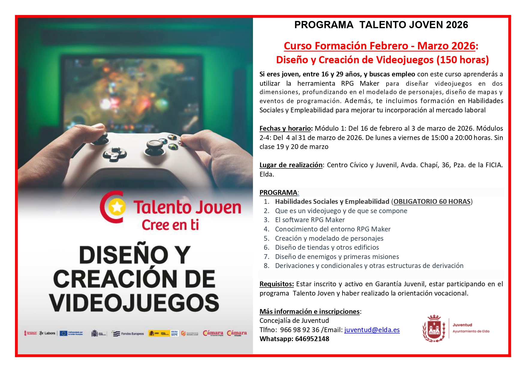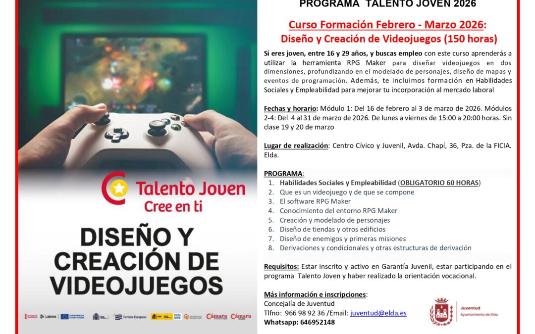 El Ayuntamiento de Elda, a través de la Concejalía de Juventud, ofrece un curso gratuito de diseño y creación de videojuegos. Se trata de una formación dirigida a jóvenes de entre 16 y 29 años sin empleo y que estén inscritos y en activo en Garantía Juvenil y participen en el programa Talento Joven.