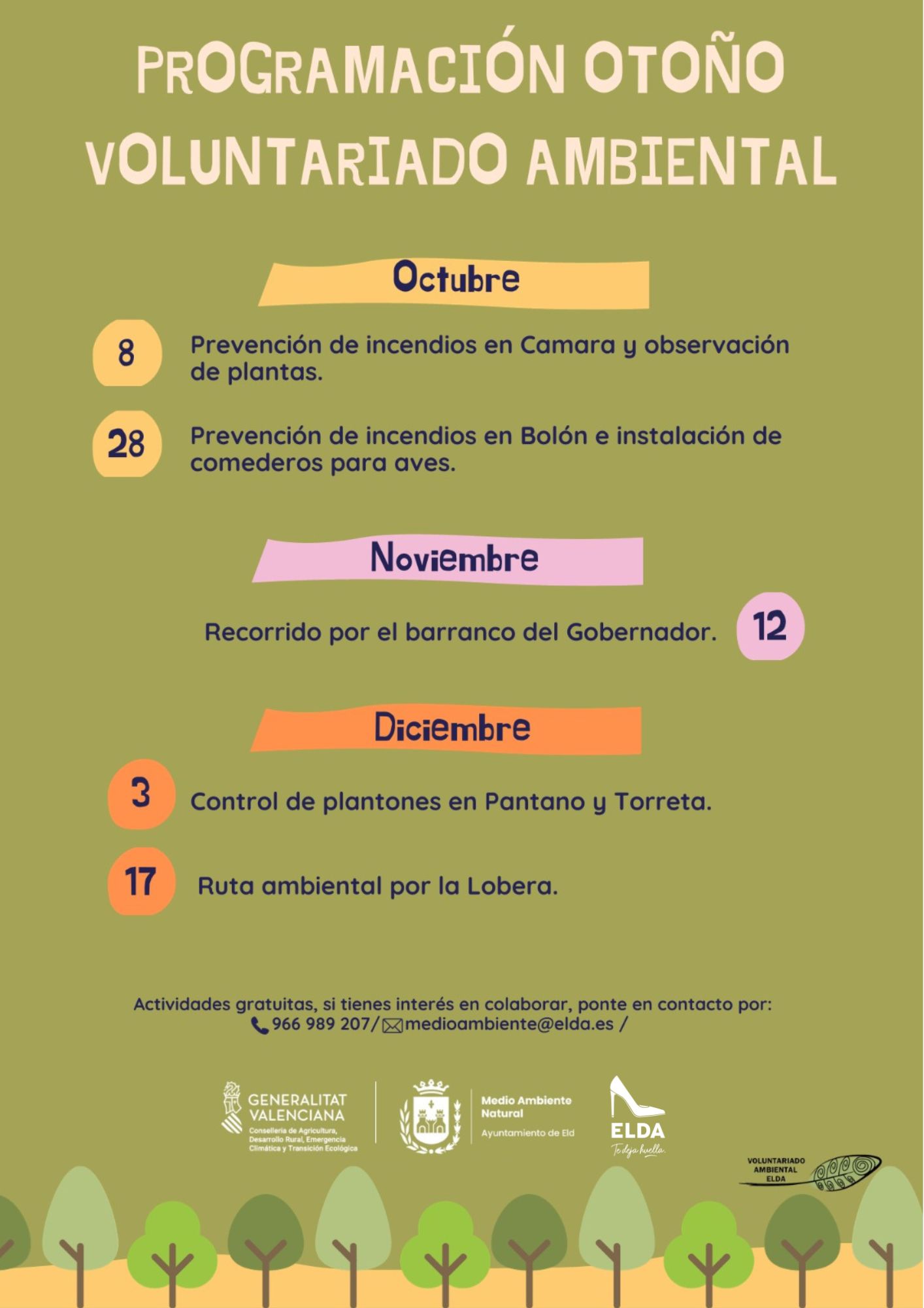 La Concejalía de Medio Ambiente ha dado a conocer hoy el calendario de actividades del voluntariado ambiental de Elda previstas para el último trimestre de 2023. La programación incluye cinco salidas en diferentes parajes y enclaves eldenses en los que se realizarán actividades como control de plantones, labores de prevención de incendios y rutas medioambientales.