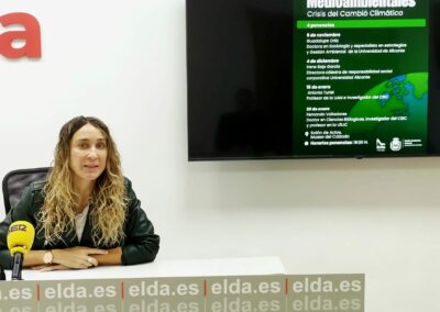 La concejala de Medio Ambiente, Cristina Rodríguez, ha destacado que “estas conferencias parten de una necesidad clara: ser conscientes de la crisis climática. Mientras la derecha niega el cambio climático, sus consecuencias devastan nuestro territorio y nuestras vidas, como lo han demostrado los incendios e inundaciones recientes. Es un deber de este este gobierno de izquierdas acercar la ciencia a la ciudadanía para reflexionar sobre el impacto de nuestro sistema en el planeta. Desde el Ayuntamiento de Elda queremos promover un cambio de mentalidad, fomentar la responsabilidad individual y colectiva, y reforzar nuestro compromiso con un futuro sostenible”.