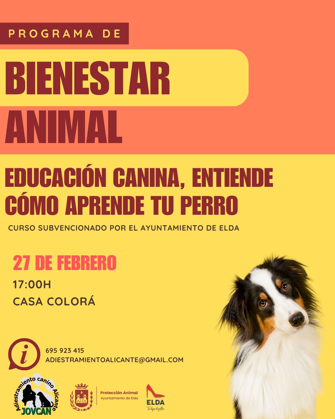 La Concejalía de Protección Animal del Ayuntamiento de Elda, en colaboración con la empresa Jovcan, pone en marcha un nuevo programa de actividades de asesoramiento y formación dirigidas a personas con perro, con el objetivo de fomentar una tenencia responsable, mejorar el comportamiento de los animales y favorecer una convivencia adecuada tanto entre perros como con el resto de la ciudadanía de Elda.