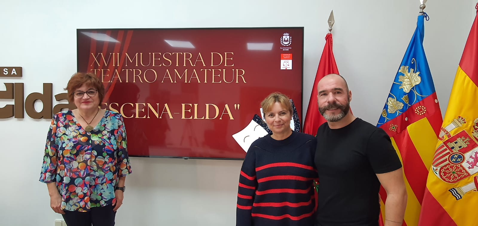 La concejala de Teatro, Rosa Vidal, acompañada de Sacra Leal, en representación de Carasses, y de Matías González, presidente de la Federación de Teatro Amateur de la Comunidad Valenciana, ha presentado hoy la edición número 17 de la Muestra de Teatro Amateur ‘Escena Elda’ que, en palabra de Vidal, “llega con muchas novedades, destacando el carácter internacional que tendrá”.
