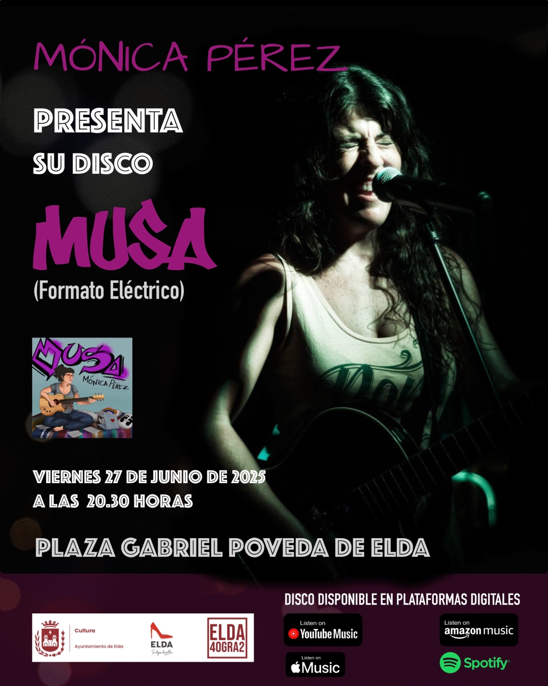 La programación cultural de Elda 40gra2 continúa llenando las calles de la ciudad de música, arte y espectáculos. Este viernes, 27 de junio, a las 20:30 horas, la Plaza Gabriel Poveda será escenario de uno de los conciertos más especiales de esta edición, con la actuación de la eldense Mónica Pérez, que presentará en directo su primer disco, ‘Musa’.