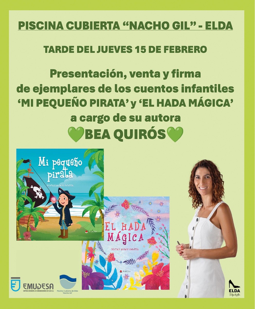La escritora eldense Bea Quirós presentará mañana jueves sus dos cuentos infantiles en las instalaciones de la Piscina Cubierta Nacho Gil. El acto tendrá lugar por la tarde y la autora firmará libros para los asistentes que lo deseen. Se trata de un evento cultural, organizado por el Ayuntamiento de Elda a través de Emudesa, y dirigido a los más pequeños, que pueden disfrutar de las dos obras de literatura infantil que Bea Quirós tiene publicadas: ‘El hada mágica’ y ‘Mi pequeño pirata’.