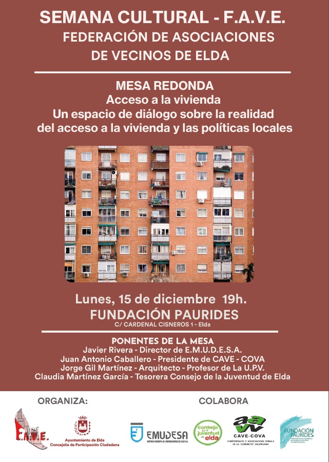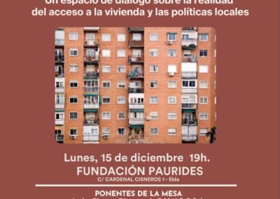 • Lunes, 15 de diciembre. Mesa redonda: ‘Acceso a la vivienda. Un espacio de diálogo sobre la realidad del acceso a la vivienda y las políticas locales’.
