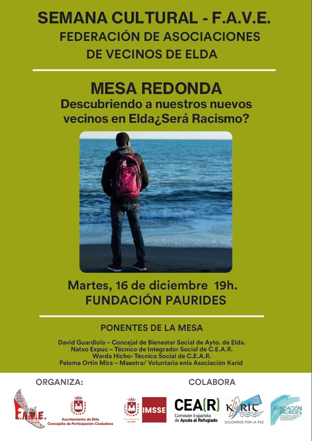• Martes, 16 de diciembre. Mesa redonda: ‘Descubriendo a nuestros nuevos vecinos en Elda ¿Será racismo?’