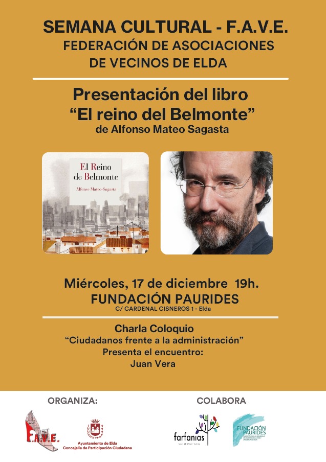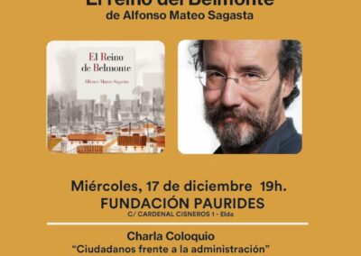 • Miércoles, 17 de diciembre. Presentación del libro ‘El reino de Belmonte’, de Alfonso Mateo Sagasta y charla coloquio ‘Ciudadanos frente a la administración’.