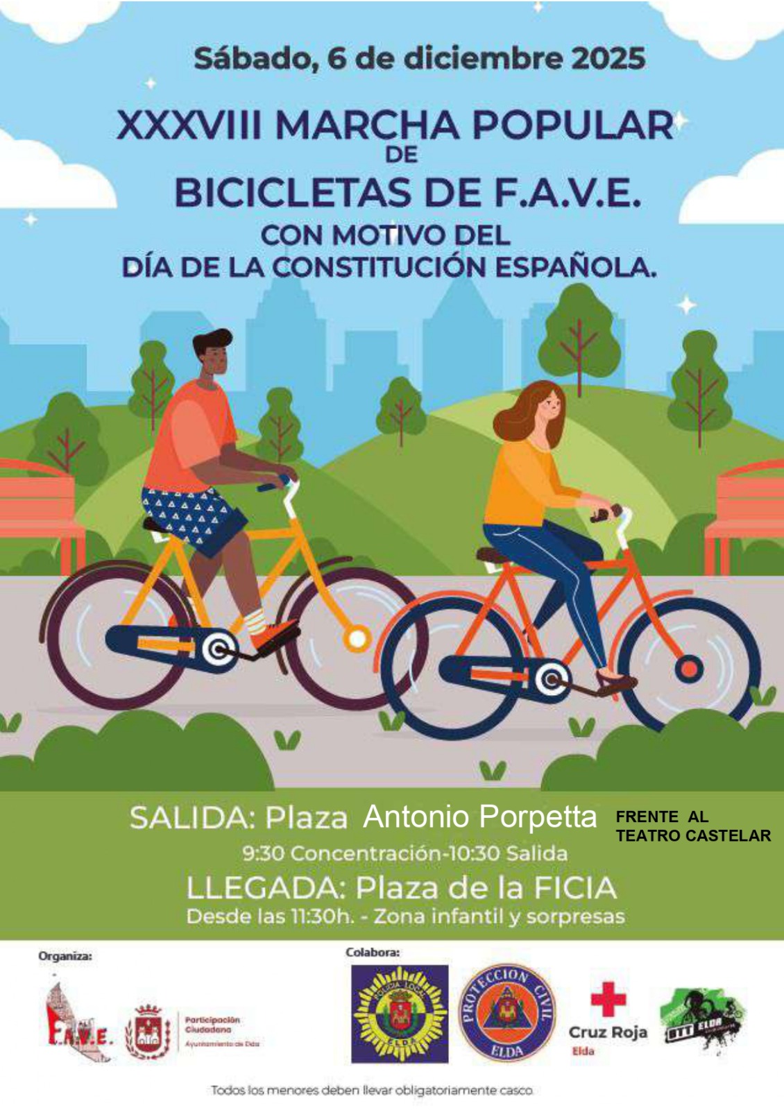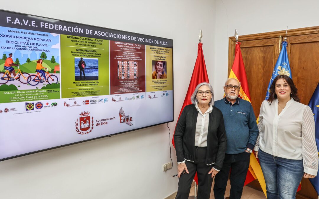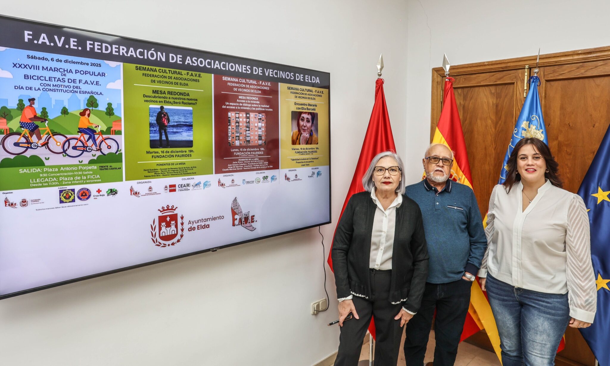 El Ayuntamiento de Elda, a través de la Concejalía de Participación Ciudadana, y la Federación de Asociaciones de Vecinos de Elda (FAVE), organizan un año más la tradicional Marcha Popular de Bicicletas para conmemorar el 6 de diciembre, Día de la Constitución. Así lo han anunciado esta mañana la concejala de Participación Ciudadana, Lorena Pedrero, la presidenta de la FAVE, María Salud Corbí, junto a Pepe Busquier, vocal de la FAVE.