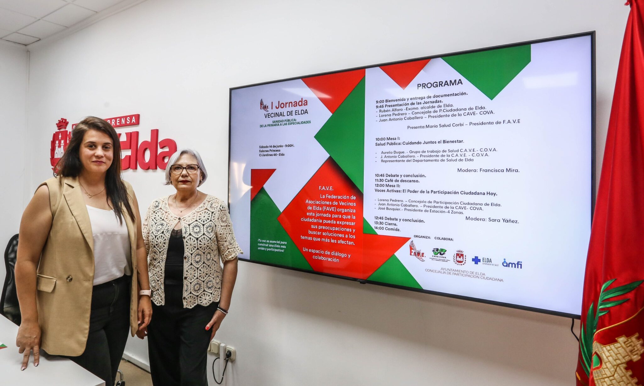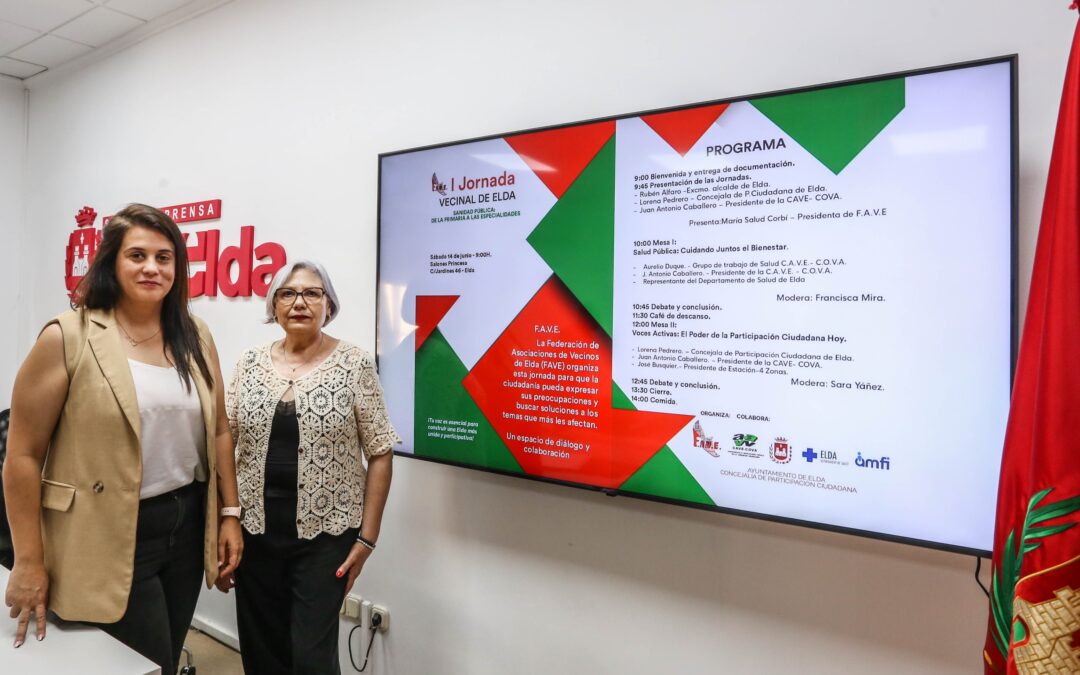 La Federación de Asociaciones de Vecinos de Elda (FAVE) ha organizado la I Jornada Vecinal ‘Sanidad Pública: de la Primaria a las Especialidades’, que se celebrará el próximo 14 de junio, a partir de las 9.00 horas en los Salones Princesa. El objetivo de este encuentro es «fomentar la participación ciudadana, impulsar la salud comunitaria, fortalecer el tejido asociativo y buscar soluciones reales», tal y como ha explicado esta mañana la concejala de Participación Ciudadana, Lorena Pedrero.