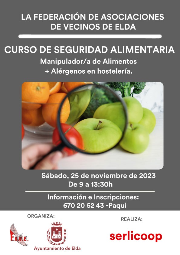 Paqui Mira ha afirmado que «el segundo curso, sobre Seguridad Alimentaria, es muy interesante y muy útil, llevamos varios años ofreciéndolo desde FAVE. Es una formación para aprender a manipular alimentos, no sólo en la hostelería, también en el hogar. Tendrá lugar el sábado 25 de noviembre, de 9.00 a 13.30 horas en el Centro Cívico».
