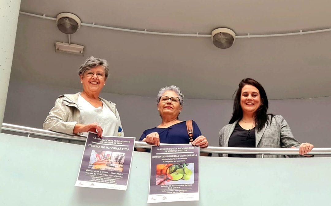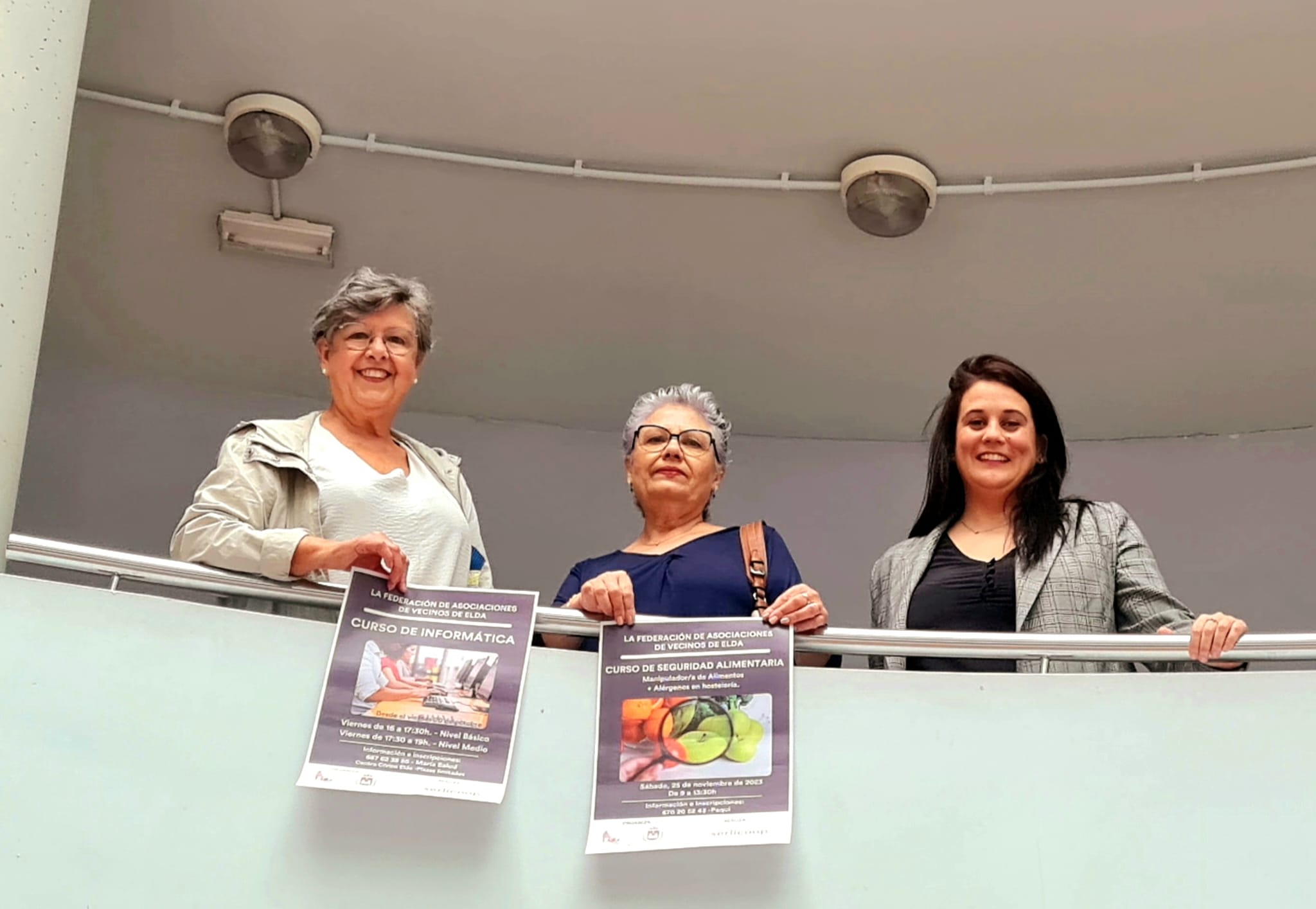 La concejala de Participación Ciudadana, Lorena Pedrero, acompañada por la presidenta de la Federación de Asociaciones de Vecinos de Elda (FAVE), María Salud Corbí, y de la vicepresidenta de la misma, Paqui Mira, ha presentado los dos cursos que la FAVE va a ofrecer en las instalaciones del Centro Cívico y Juvenil.