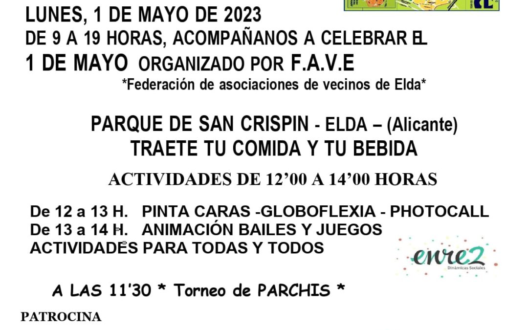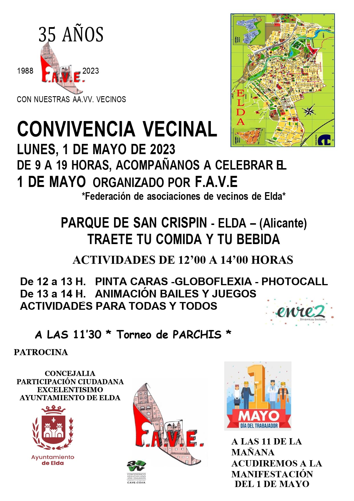 El Ayuntamiento de Elda, a través de la Concejalía de Participación Ciudadana, junto a la Federación de Asociaciones de Vecinos de Elda (FAVE), organiza la tradicional jornada de convivencia con motivo de la celebración del 1 de Mayo. El concejal de Participación Ciudadana, Javier Rivera, acompañado por el presidente de FACE, Antonio Cuenca, ha explicado que “Elda es una ciudad con el corazón industrial levantada por las manos de la clase trabajadora. Por eso, un año más volvemos a resaltar la importancia del mundo del trabajo y del tejido vecinal en la sociedad eldense”.