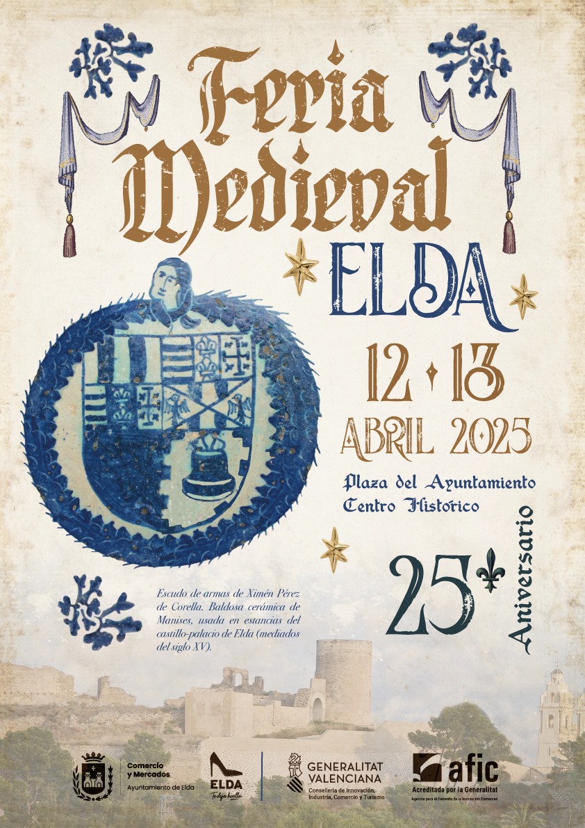 El cartel que ilustra la Feria Medieval de este año gira alrededor del Escudo de armas de Ximén Pérez de Corella, que aparece en una baldosa de cerámica de Manises, datada a mediados del siglo XV y empleada en las estancias del Castillo-Palacio de Elda.