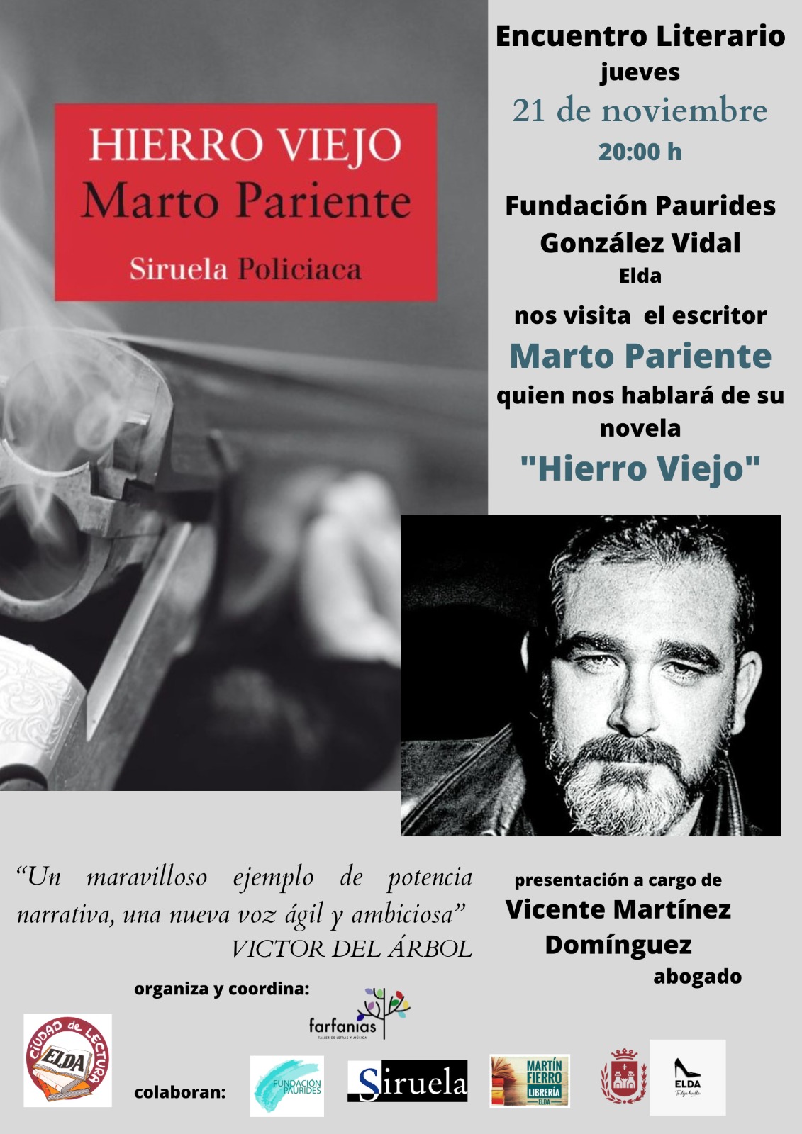 El concejal de Cultura, Iñaki Pérez, ha anunciado hoy el nuevo encuentro literario que tendrá lugar el próximo jueves, 21 de noviembre en la Fundación Paurides a las 20:00 horas. El escritor invitado es el madrileño Marto Pariente que presentará su novela ‘Hierro Viejo’, una enérgica novela negra en clave de western crepuscular. El encargado de presentar el acto será el abogado Vicente Martínez Domínguez.
