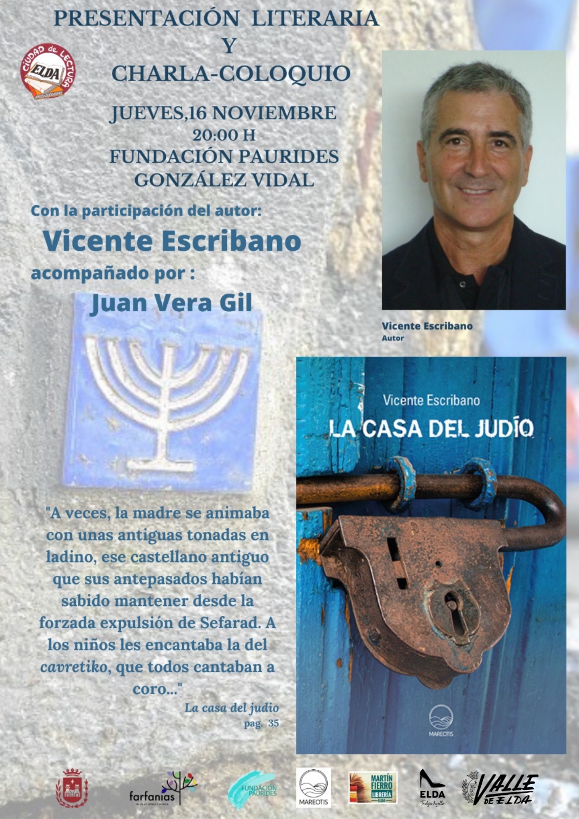 La Fundación Paurides acoge mañana, a partir de las 20.00 horas, un encuentro literario con el autor Vicente Escribano, quien presentará su libro ‘La casa del judío’ en un acto moderado por Juan Vera. Vicente Escribano, químico de profesión, ha trabajado en ACNUR, la agencia de la ONU para los refugiados, y también ha viajado por diferentes países. Se convirtió en escritor tras su prejubilación cuando escribió su primera novela ‘Es un soplo de vida’, una reflexión sobre el siglo XX a través de la vida de dos hermanos.